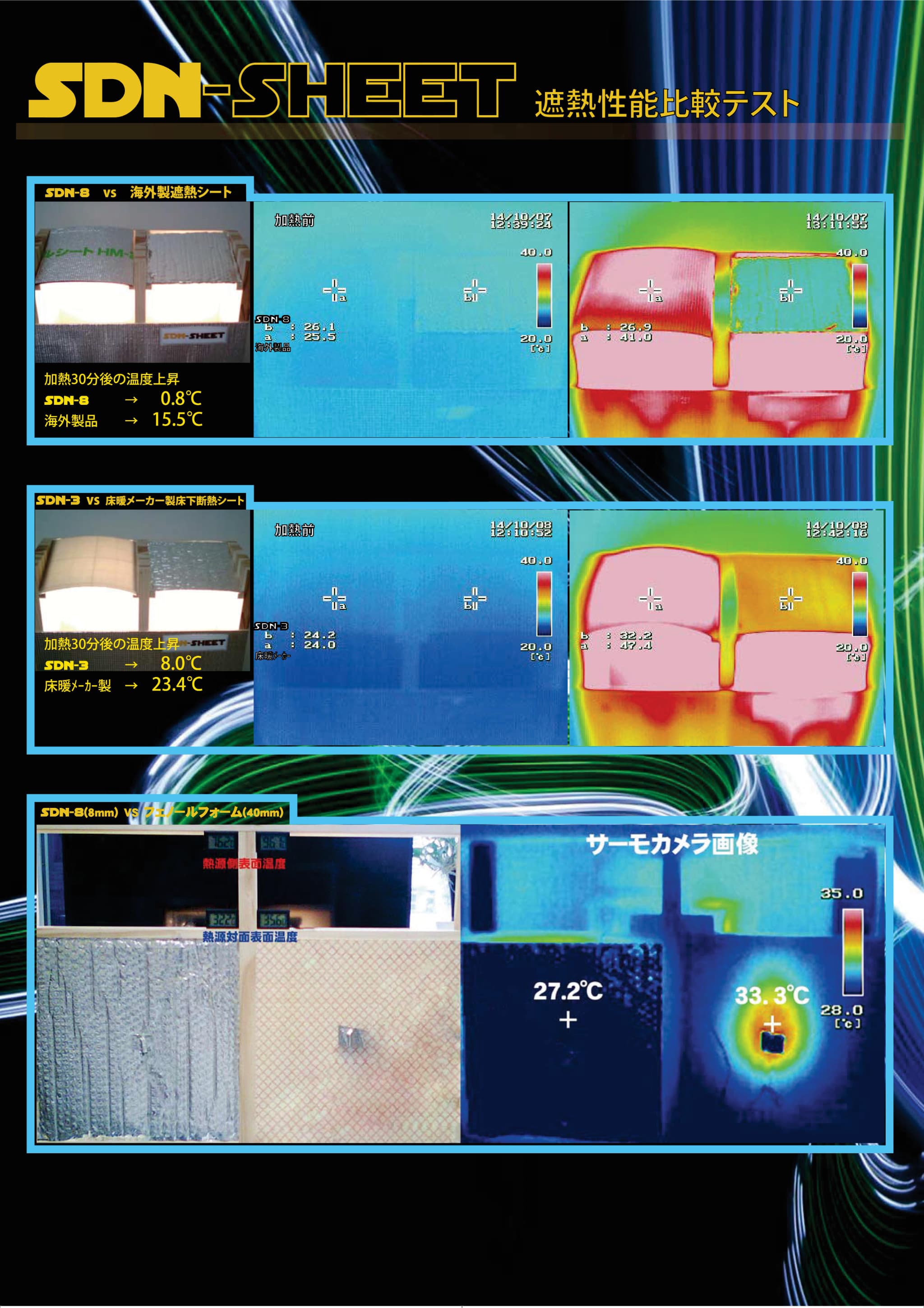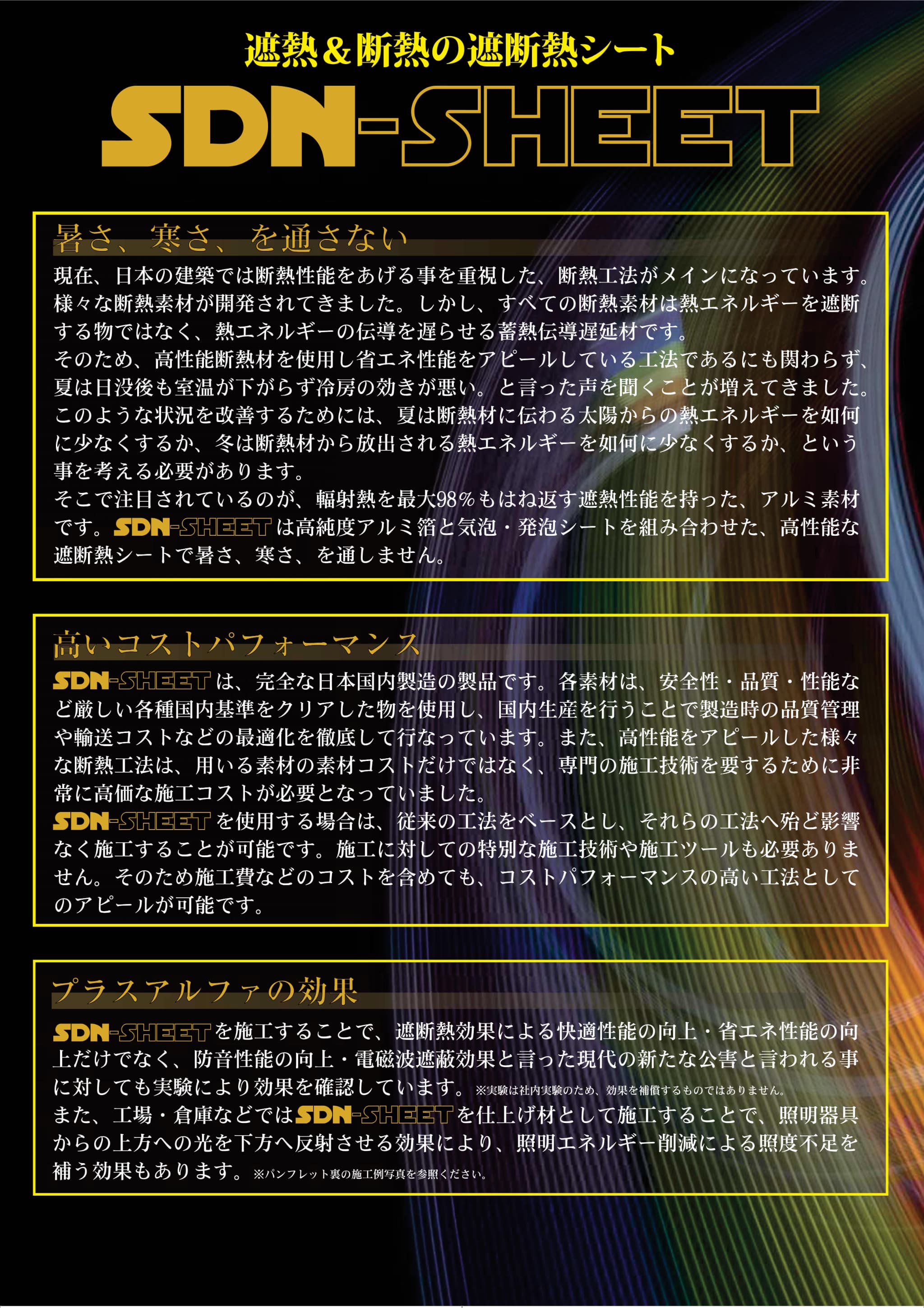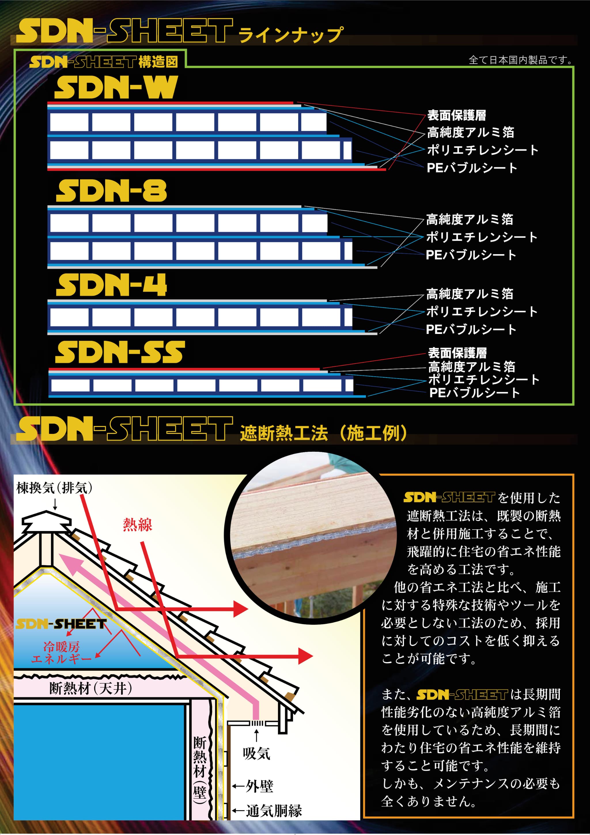 遮熱理論を目の当たりにし、SDN-SHEET®によって、夏は外界からの熱(赤外線)を遮り、冬は、室内で暖房などにより発生させた熱を断熱材の内部に留め置く、この手法にいきついたわけです。これを弊社では、「遮断熱工法」と読んでおります。