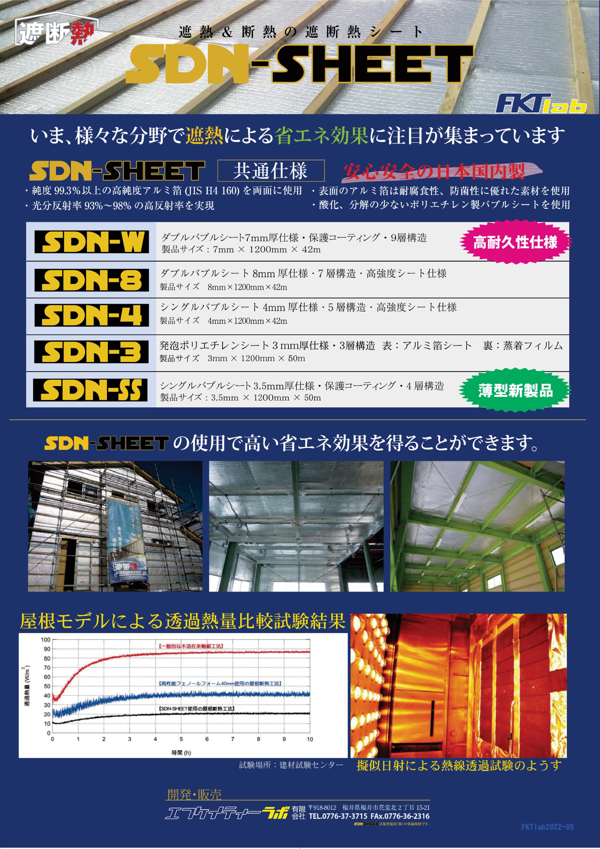 耐震関係のお問い合わせと同時に、多方面から弊社が標準仕様として使っている「遮断熱シート SDN-SHEET®」についてのお問い合わせも多数いただいております。このSDN-SHEET®は元々、弊社が次世代の省エネ性を担保するための建材として、16年前(2006年)より開発してきたものですが、平成28年12月に弊社関連会社として「エフケイティーラボ有限会社」を設立し、同社に研究開発、販売等を移管した経緯がございます。