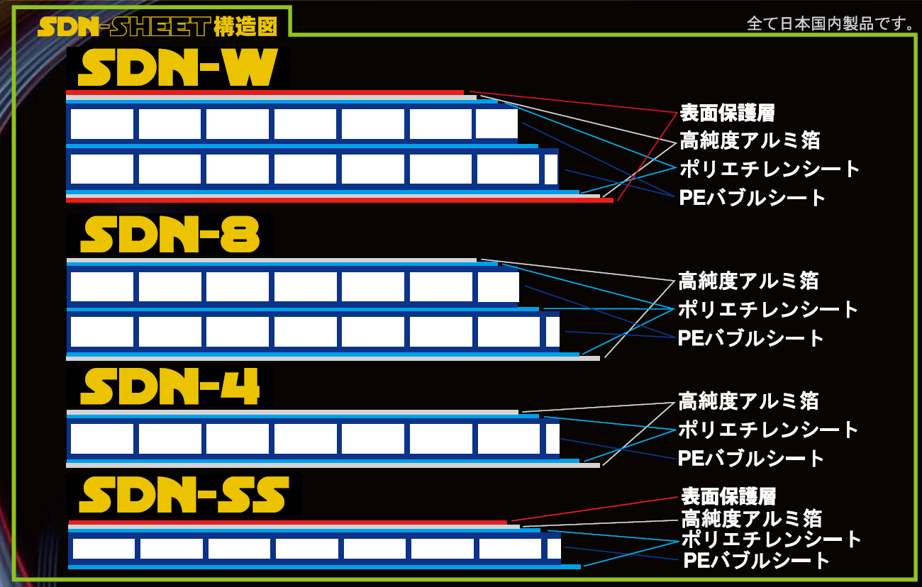 SDN-SHEET®は、高純度アルミ箔(純度99.3%以上、JIS H4 160)を表面とし、内部にPEバブルシート(通称、プチプチ)で構成されています。不思議な物理現象で、空気層をアルミで挟むと熱が伝播しない、完全に、熱を断ち切ることができるのです。以下は、SDN-SHEET®の構成図です。構成される素材はすべて「国産」です。