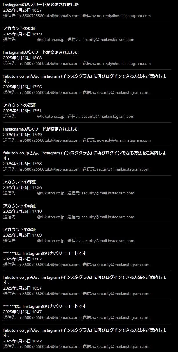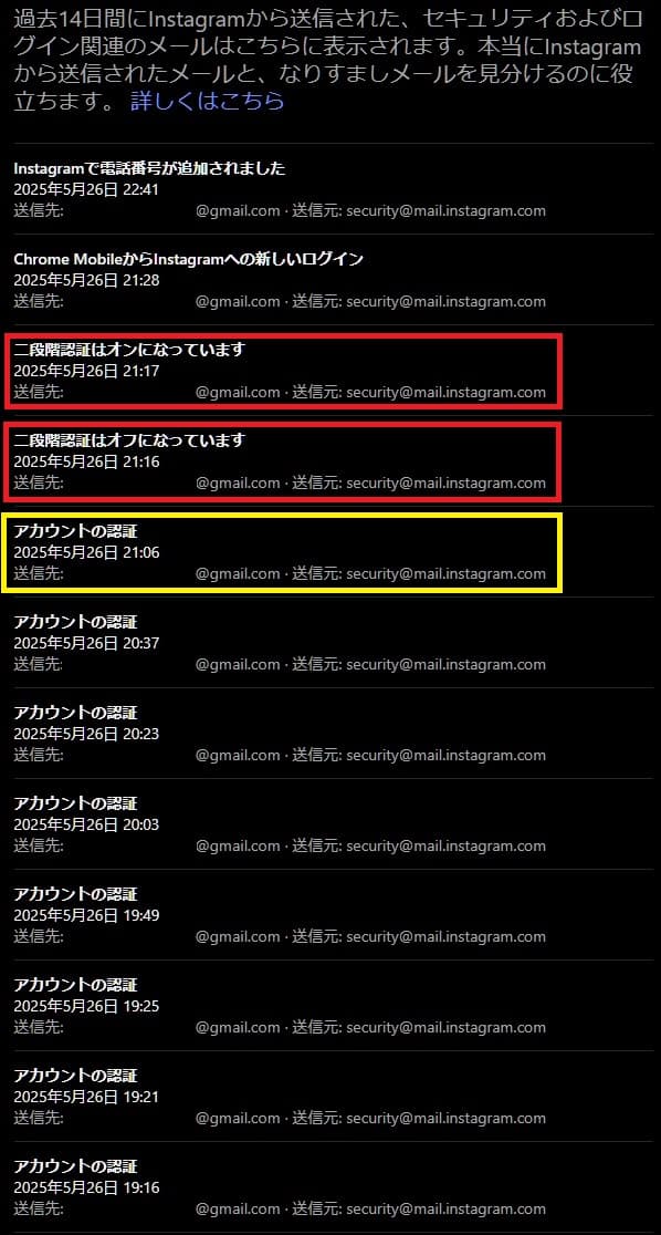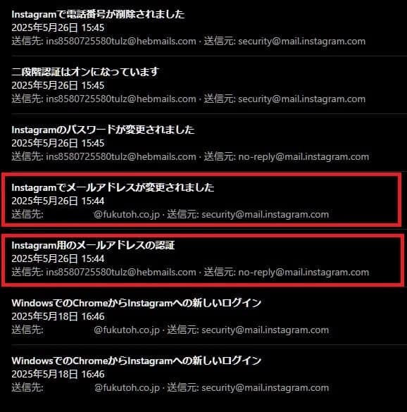 そして、赤枠のところなんですが、「2025/05/26 15:44」に、いきなり、「Instagram用のメールアドレスの認証」と「Instagramでメールアドレスが変更されました」というメールが送られてきています。そして、パスワードが変更され、さらに、二段階認証をオンにされ、再設定用の電話番号が削除されました。ようするに、弊社のInstagramのアカウントの設定そのものをすべて変更してしまったということです。
