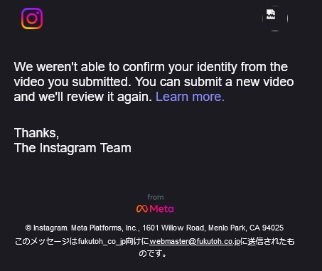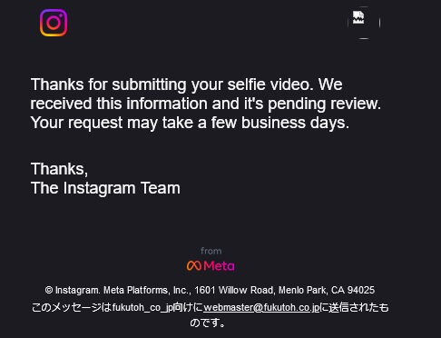 となっていました。また、メール内のハイパーリンクのアドレスも、Meta社のサーバーをさしておりましたので、このメールは、Meta社からのものであるという判断をしたわけです。