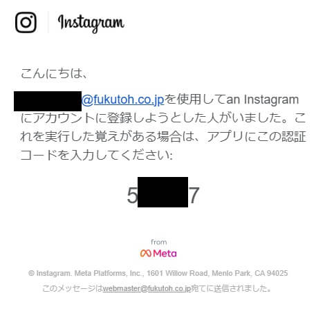 この画像は、弊社アカウントの「Metaアカウントセンター」から確認できる「Instagramからのメール」です。セキュリティ上、弊社の設定メールは黒塗りしております。