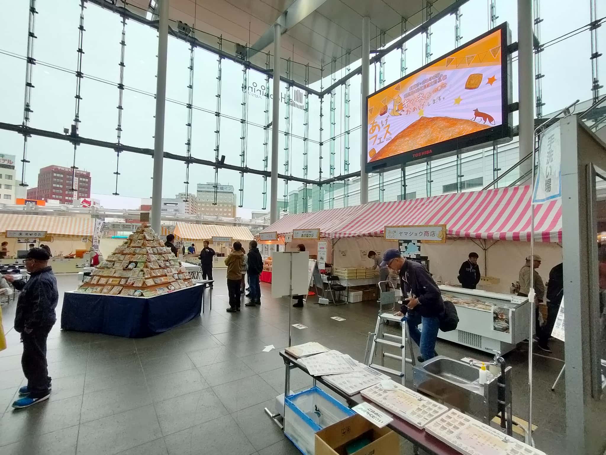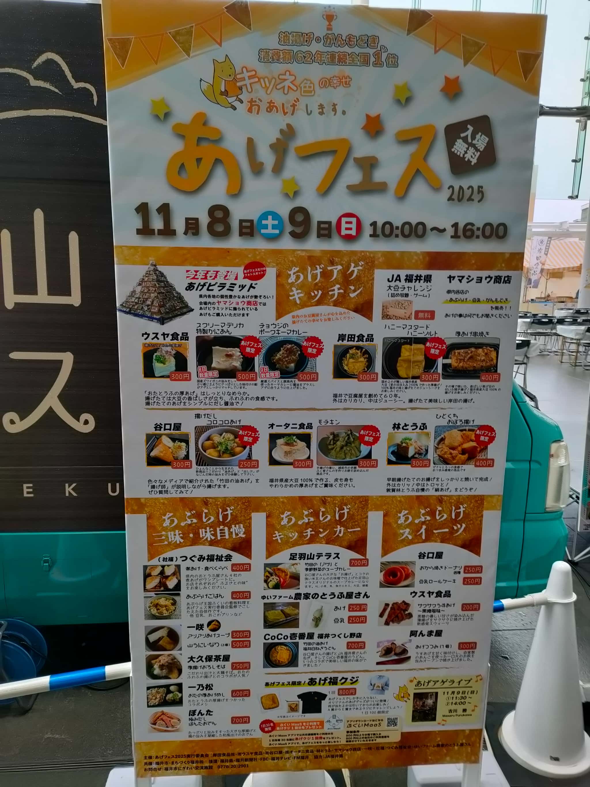 そんなご当地名物の油揚げとがんもどきをメインとするイベントが、11月8日、9日の両日に「あげフェス2025」として開催されました。「あげフェス」自体は、2019年の第一回開催から6回目となるフェスです。このフェスでは県下の油揚げを使った料理や、またスイーツなどを販売するのですが、毎回、かなりの人出になりますw というわけで、今年も「並んで」きましたwww
