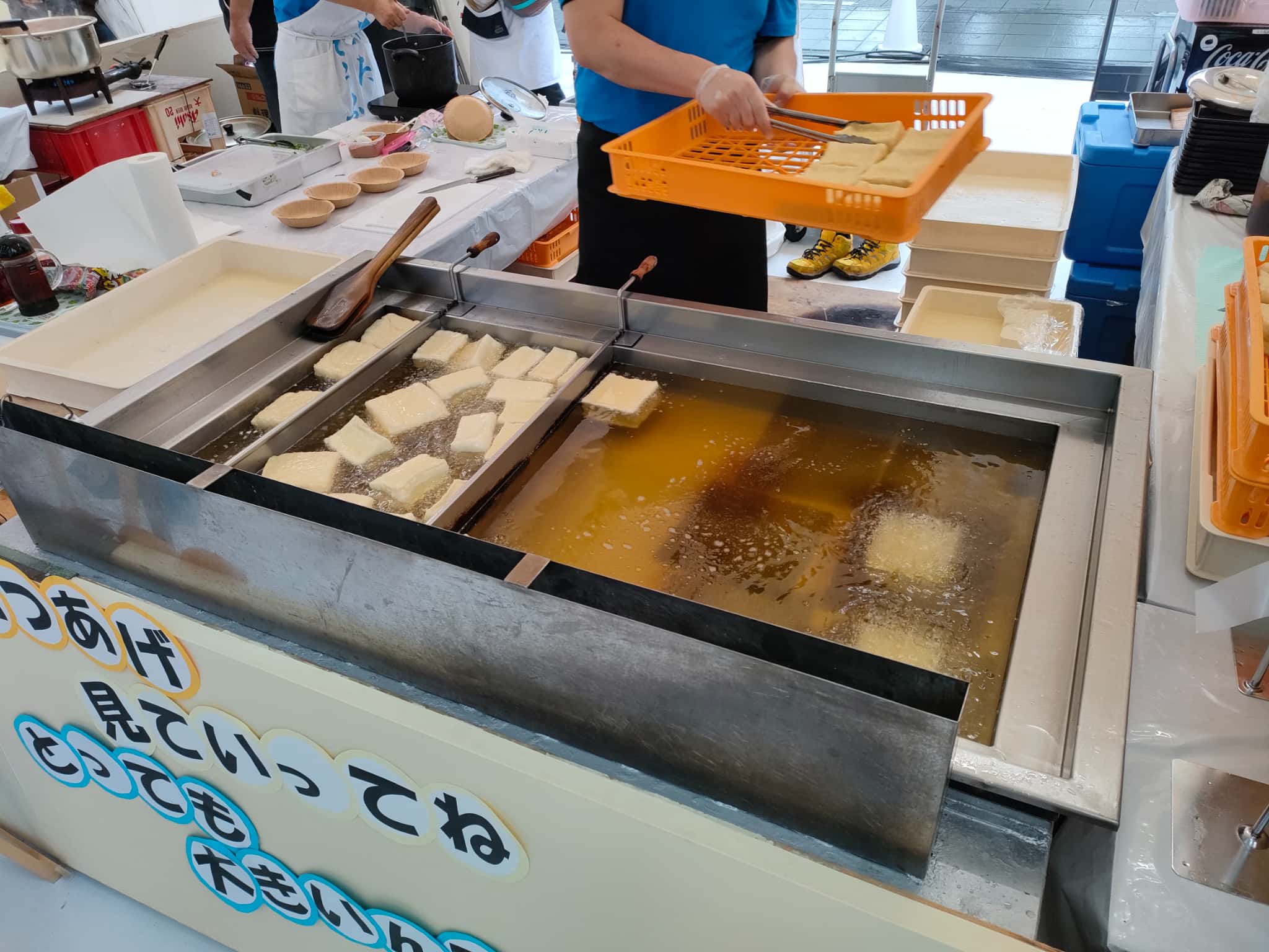 足羽山の大久保茶屋さんのところでは、オタとうふとコラボしてブースを構えておられて、油揚げをあげてるところを見せてました。