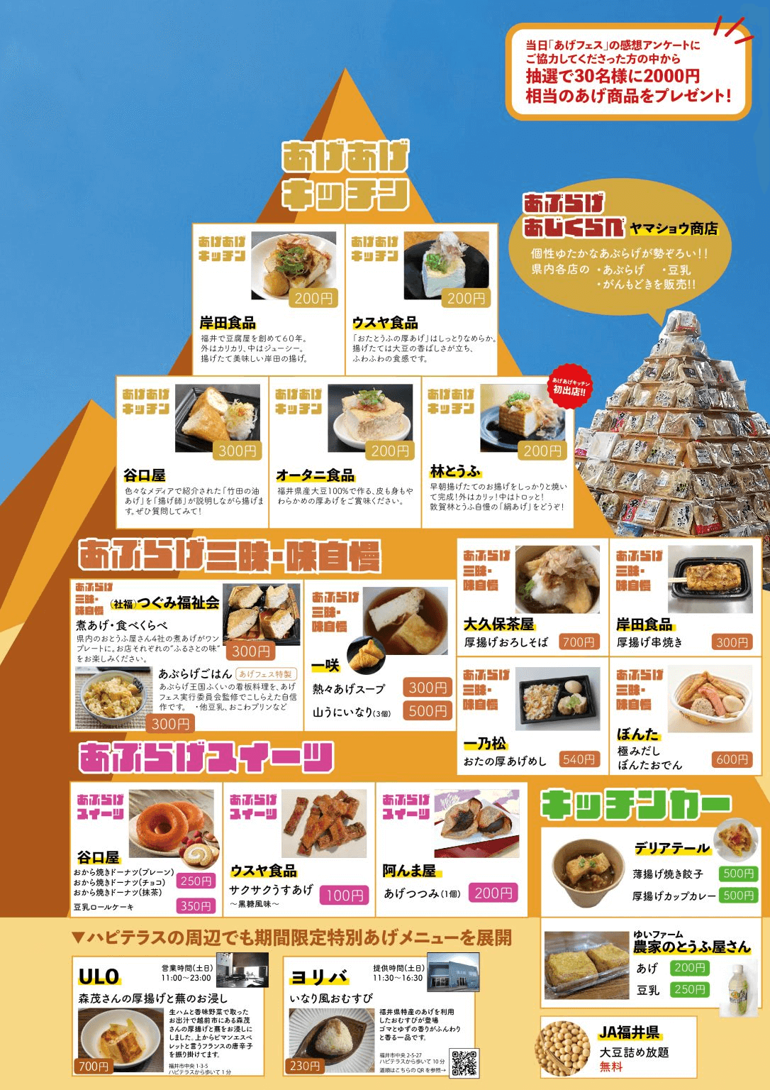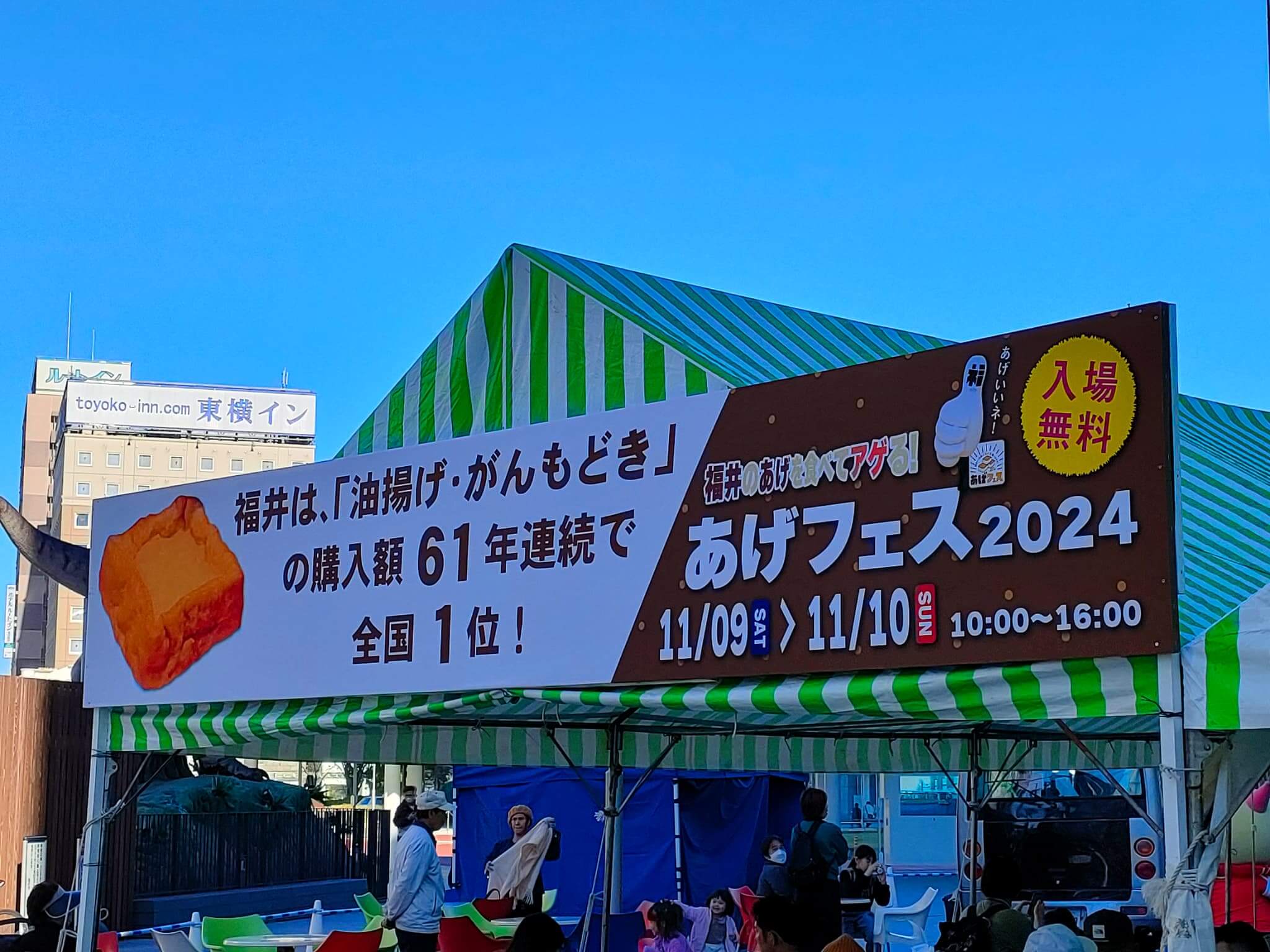 フェスは、油揚げの販売だけではなく、油揚げを使った様々な料理をフードコート形式で販売しています。油揚げを焼いて、大根おろしをつけて醤油だけで食べるというシンプルなものから、油揚げを甘くどく煮たもの(福井弁的には、あぶらげのにたの、っていいますw)、もちろん、おでんやそばの具材としてというものもありますが、意外とスイーツなんかもいい感じです。個人的には、「あぶらげのにたの」が好きですwww いくらでも食べれますw 提供している油揚げの中には、豆腐の揚げたものですので、豆腐がもめんだったり絹だったりのベースになる部分の違いを食べ比べできたりするお店もありましたw
