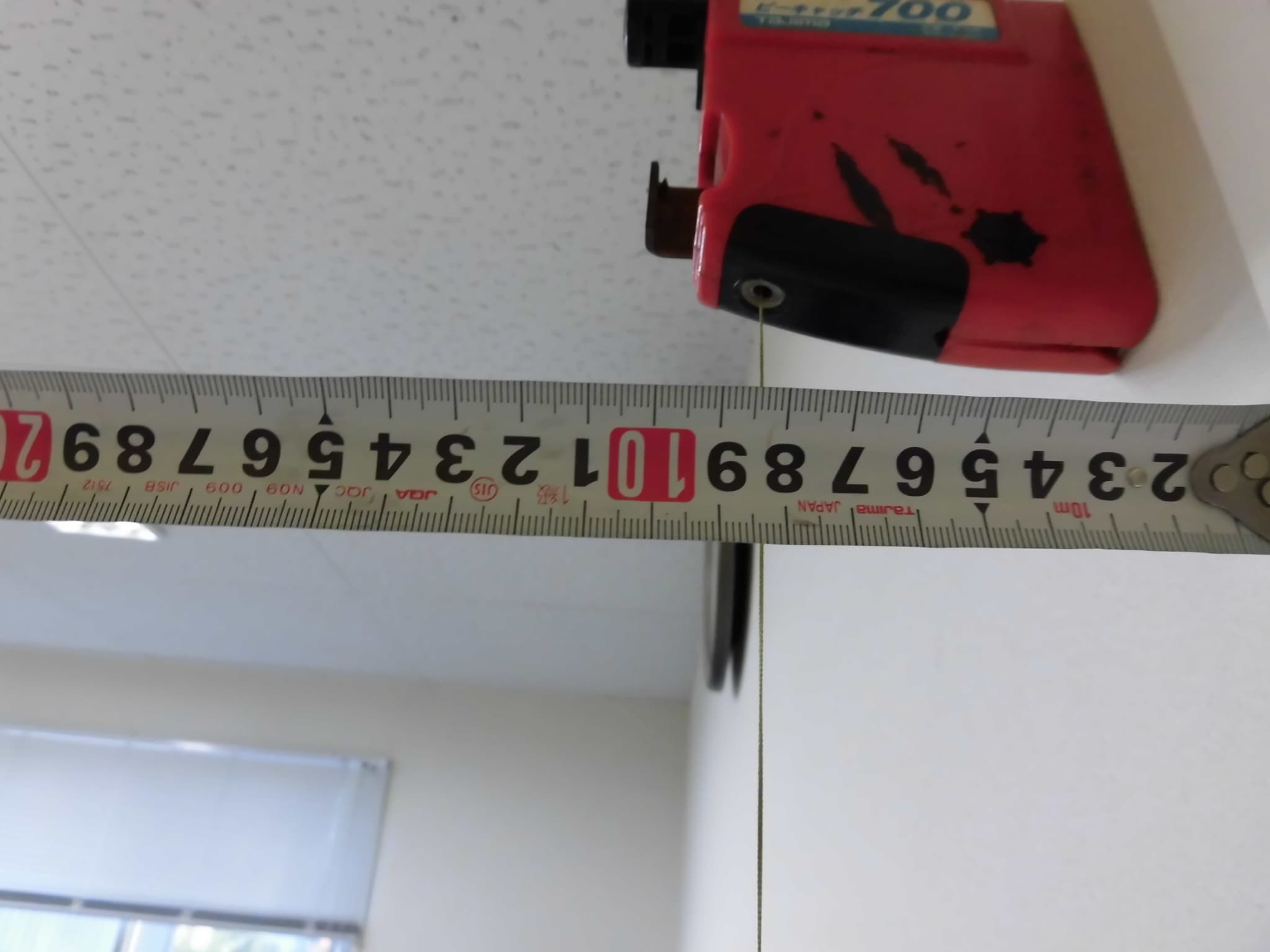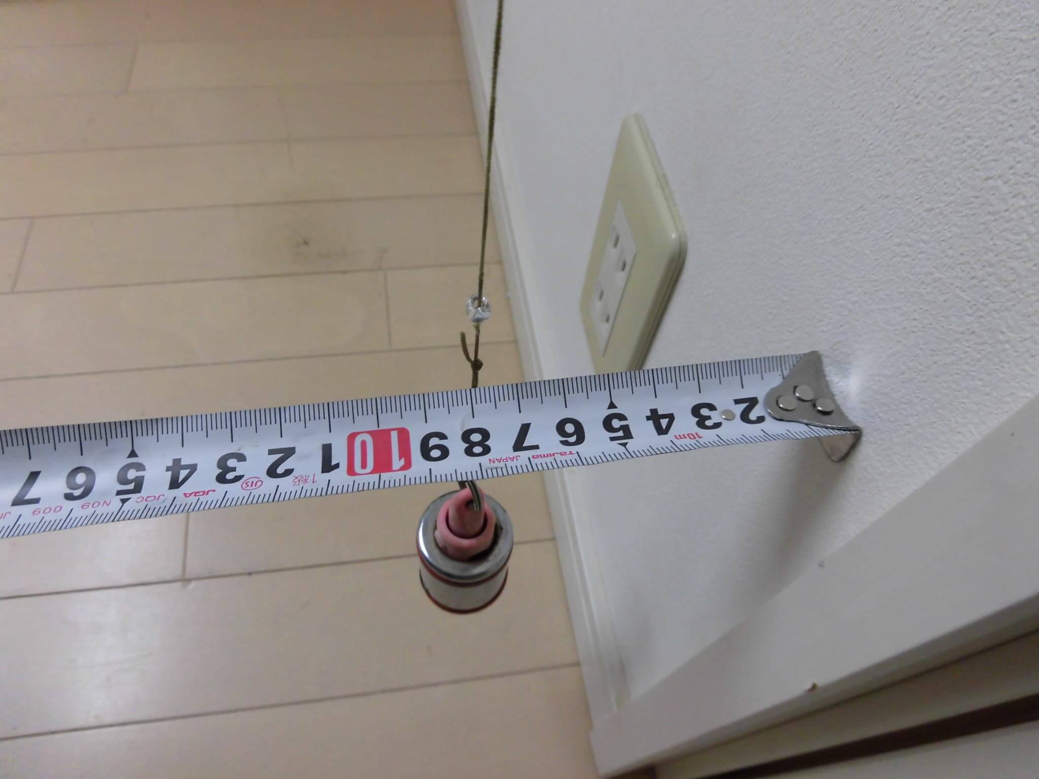そして、画像のように、下げ振りの「糸」のところで、高いところの部分と、低いところの部分で、壁からの離れを測ってください。例えば床から20cmのところと、180cmのところを測るなどを決めておくと楽かもしれません。低いところと高いところはできるだけ高低差があったほうがいいです。その測った結果、高いところも低いところも、だいたい同じくらい離れであったら(差が1mm~2mm程度)であれば問題がないと判断してもよいですが、その差がそれ以上であれば、以下の式で計算してみてください。