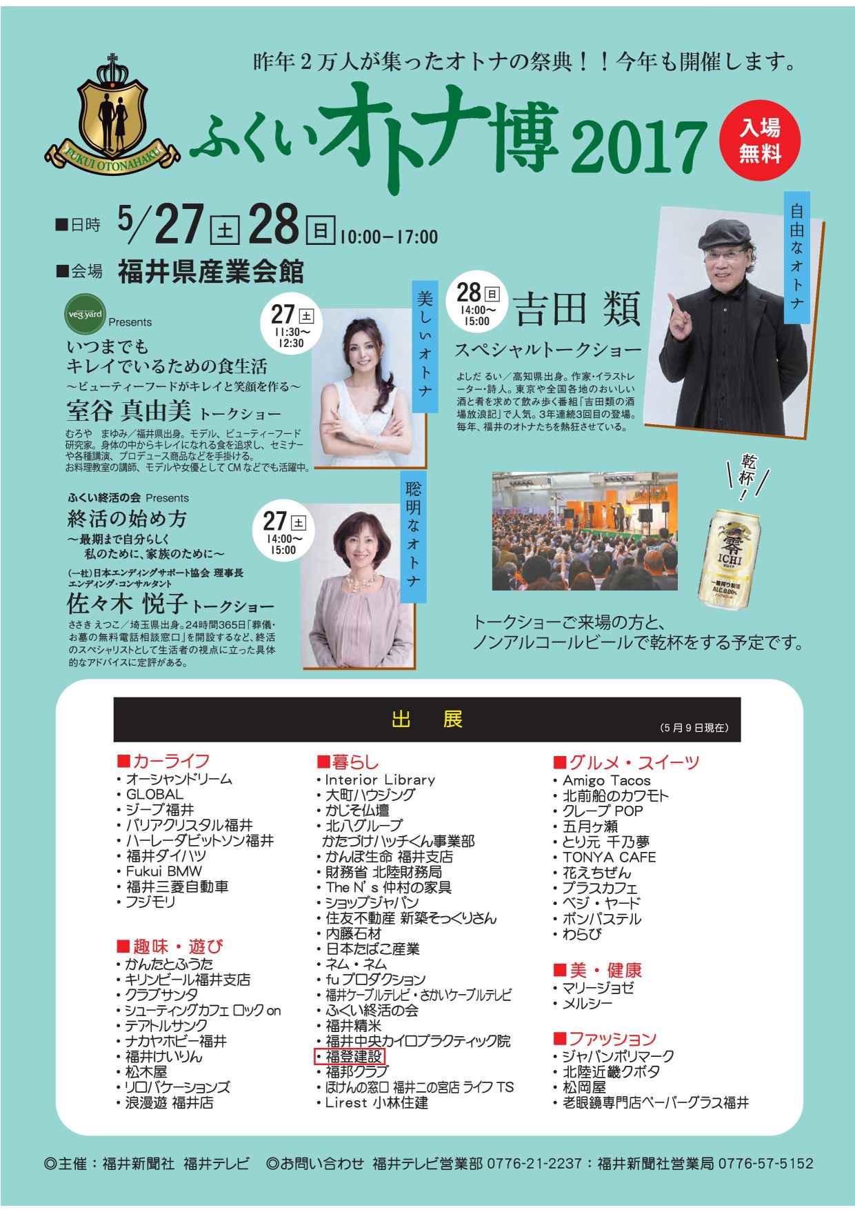 ふくいオトナ博2017に出展します! 展示会 2017.05.172024.08.27 2017年5月27日(土)~28日(日)(福井県産業会館)に開催される、「ふくいオトナ博2017」に出展いたします!出展内容は、『住まいづくりのVR無料体験会!』です。VR内覧会を出展ブースにて開催いたします!ご来場心よりお待ち申し上げております。