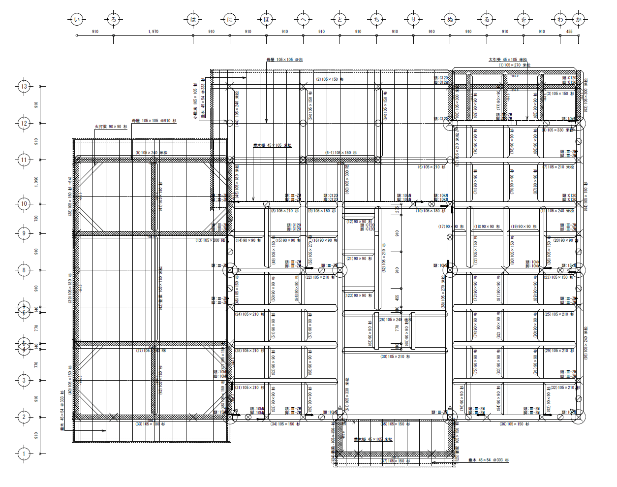 これは「構造伏図」というものです。実際に、どのように柱や梁をかけることを行うのか?また筋交いなどの耐力壁といわれるものをどこに配置するのか?といった図面です。この図面がなければ、実際に住宅を建てることはできません。