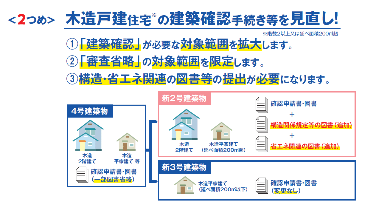 前回のブログでは3つの改正ルールについての「1つめ 全ての新築で省エネ基準適合を義務化」についてお話ししました。今回は、「2つめ 木造戸建住宅の建築確認手続き等の見直し」についてお話しします。