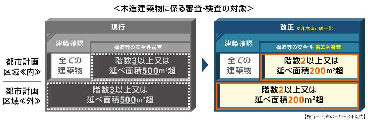 ここに、「構造等の安全性審査」という書き方がされていますが、まず都市計画区域内・外の区別があって、事実上、これまでは都市計画区域外であれば「一般的な木造住宅(2階建)」であれば、「建築確認」は必要ではありませんでした。言い換えれば、田舎の山奥では住宅を建てるための法的な審査手続きというのは事実上、なかったわけです。ところが今回の改正では、その基準がかなり引き下げられ、一般的な木造住宅(2階建)でも建築確認が必要になりました。田舎だから勝手に家を建ててもいいとか、そういうなのはほぼ無くなったわけです。