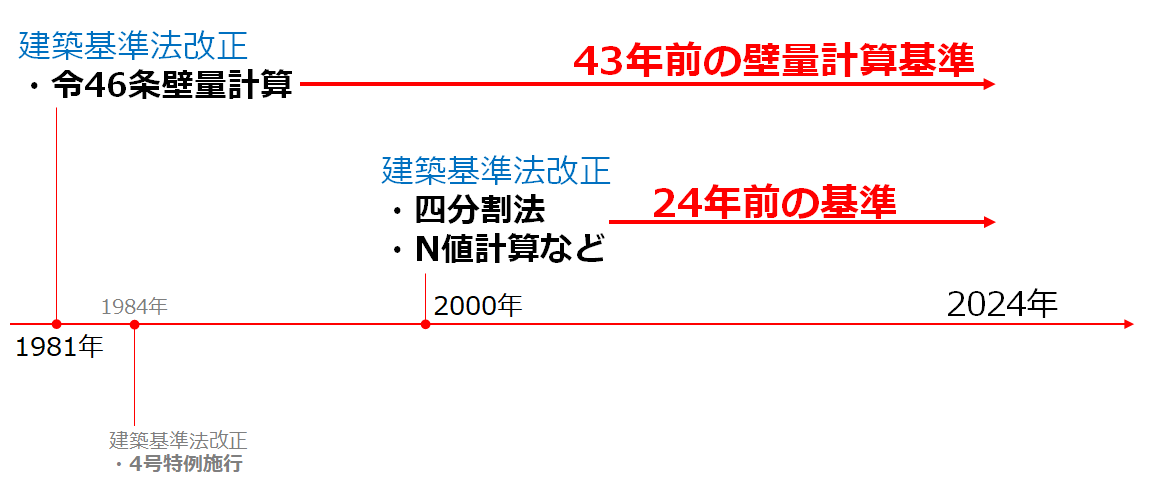 建築基準法は、その時々に発生した大規模な地震や火災など、様々な災害経験を元に都度改正されてきている法律です。昨今、メディアで多く取り上げられている「旧耐震基準」とか「新耐震基準」というのは、1978年の宮城県沖地震を踏まえ、1981年に改正された耐震基準をそれ以前のものを旧耐震、それ以降のものを新耐震といっています。そして、1995年に「阪神淡路大震災」が発生したことを踏まえ、2000年にも建築基準法が改正されています。言い換えれば、新耐震基準を1981年に制定しても「問題があった」わけです。これらの改正は、建築的には抜本的かつ重大な改正として位置付けられています。ですが、24年間、耐震基準を見直すことはなかったわけです。
