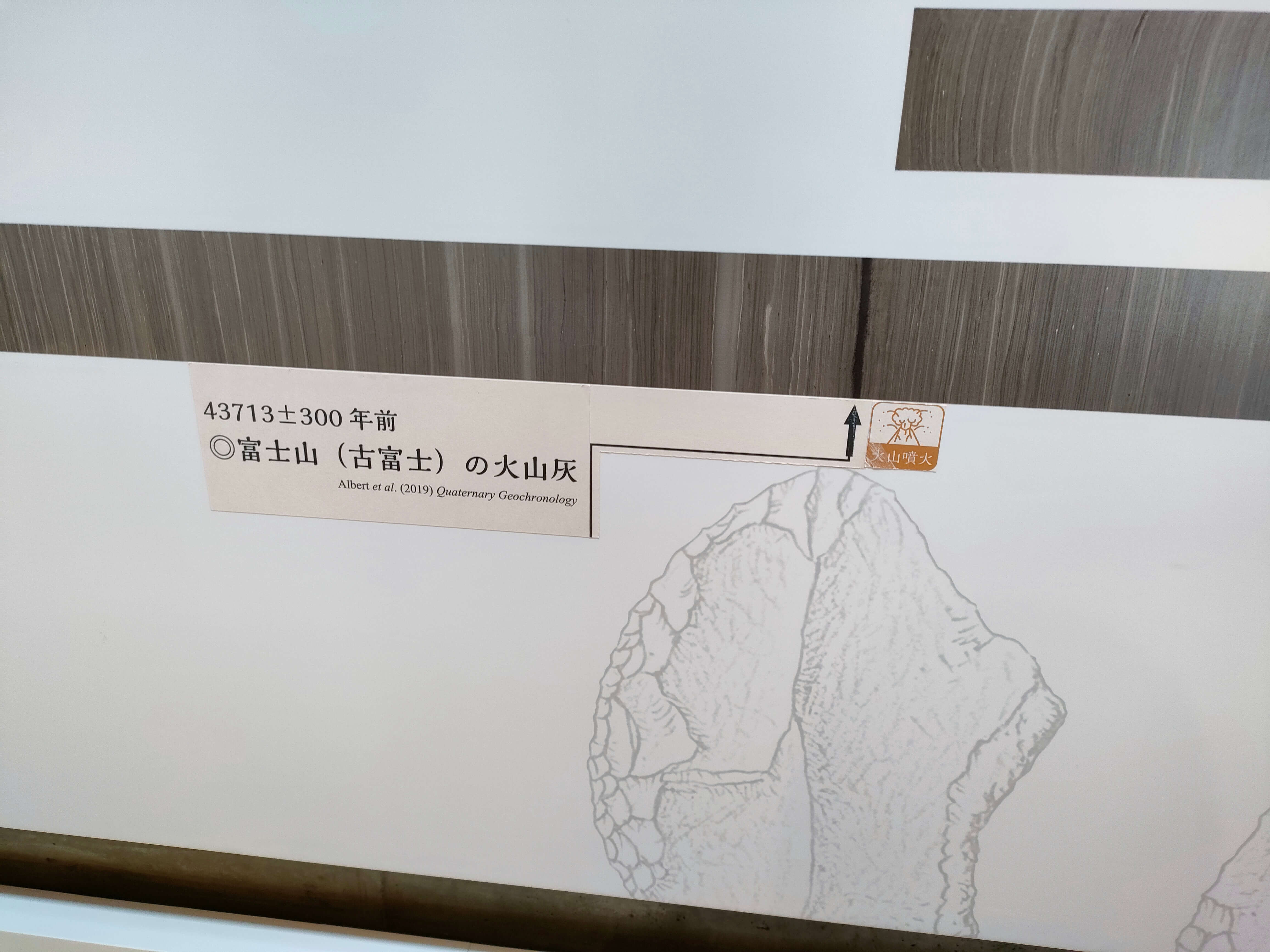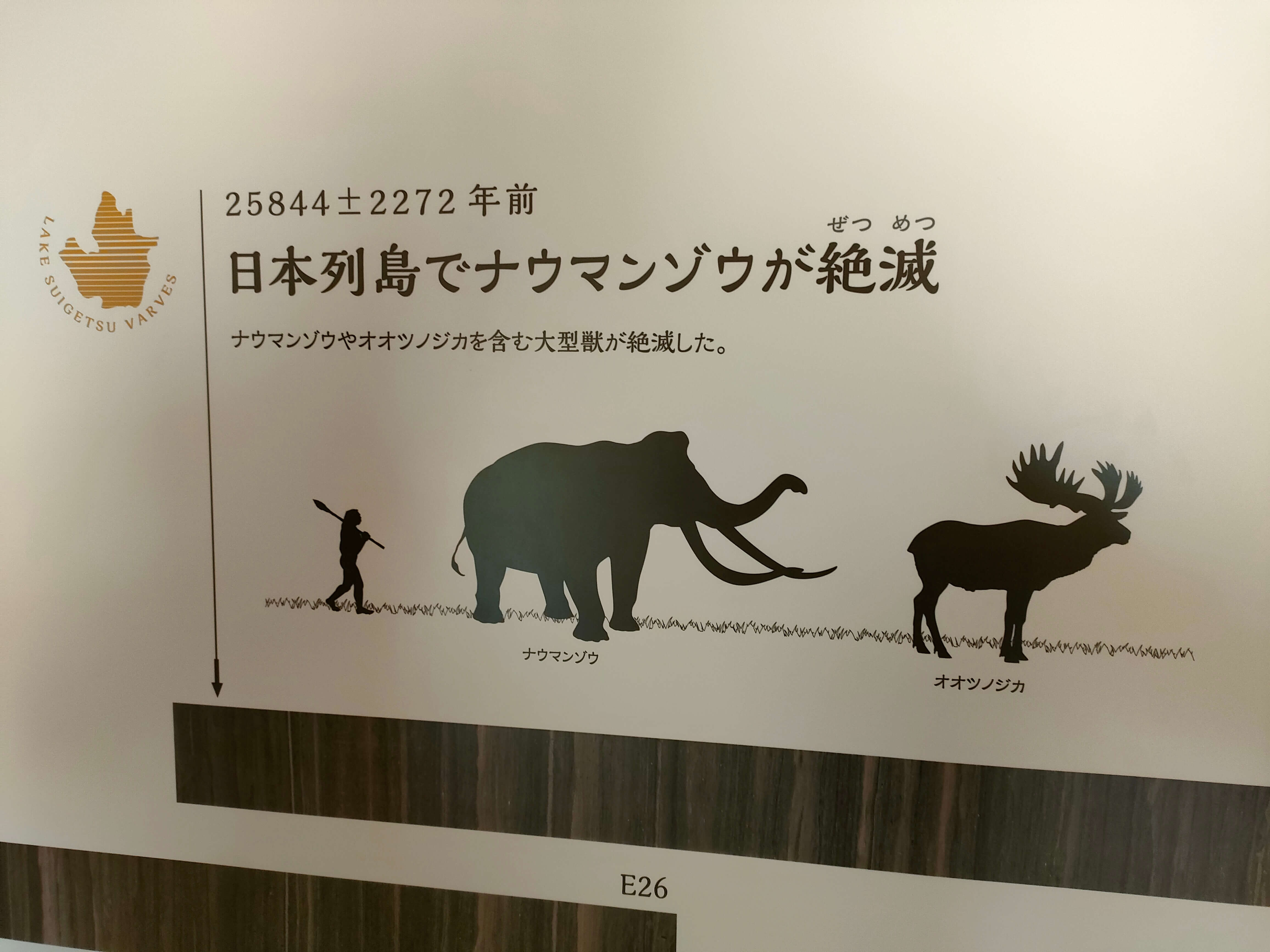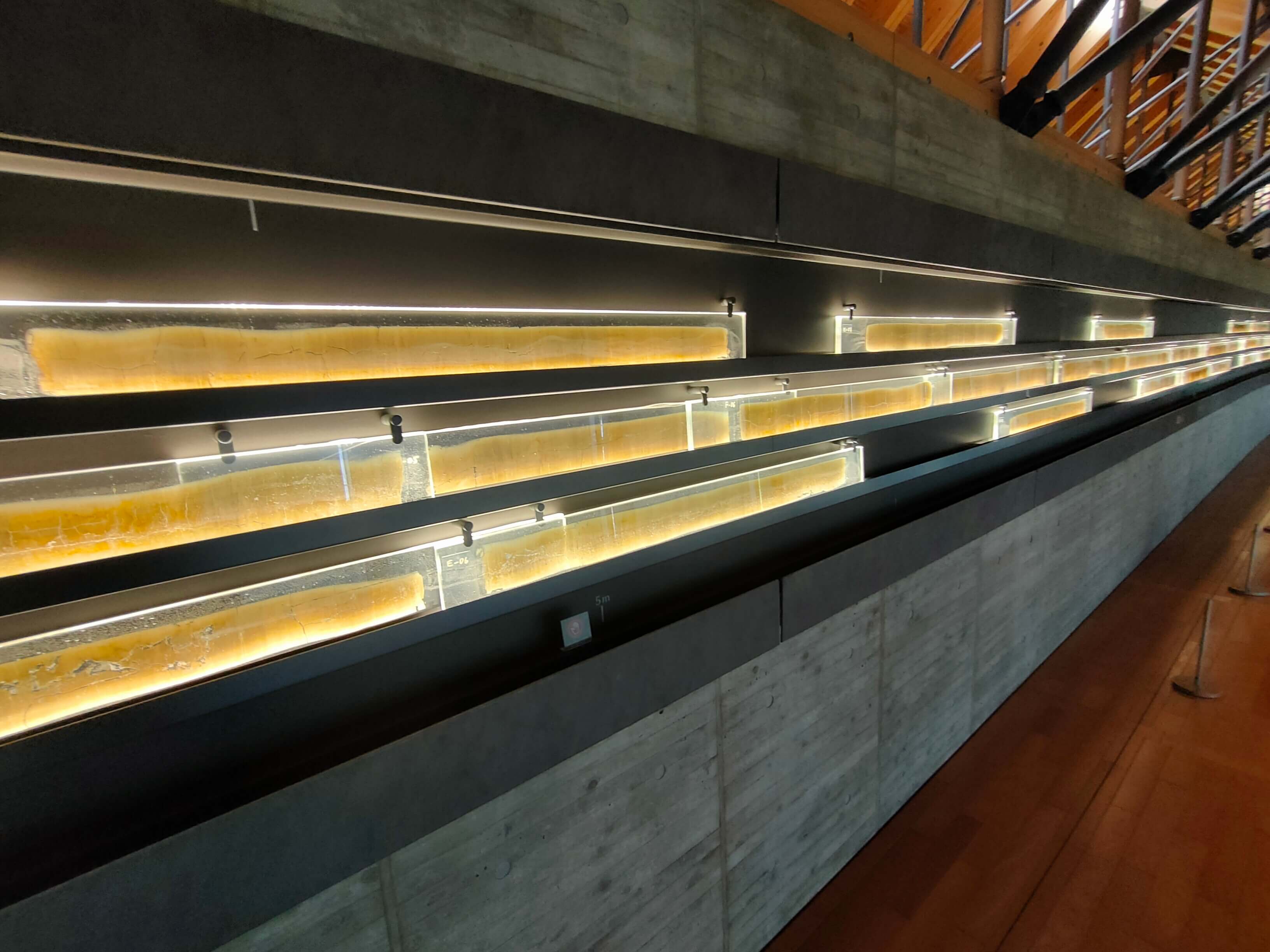 博物館には、45m、7万年分の実際に採取された年縞が展示されており、この年縞を分析した結果と歴史的イベントが掲示されています。