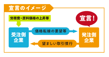 「パートナーシップ構築宣言」では、発注者の立場から、このサプライチェーン全体に対して付加価値向上と、大企業と中小企業の共存共栄を目指すものであり、これを「代表権のある者の名前」で宣言します。