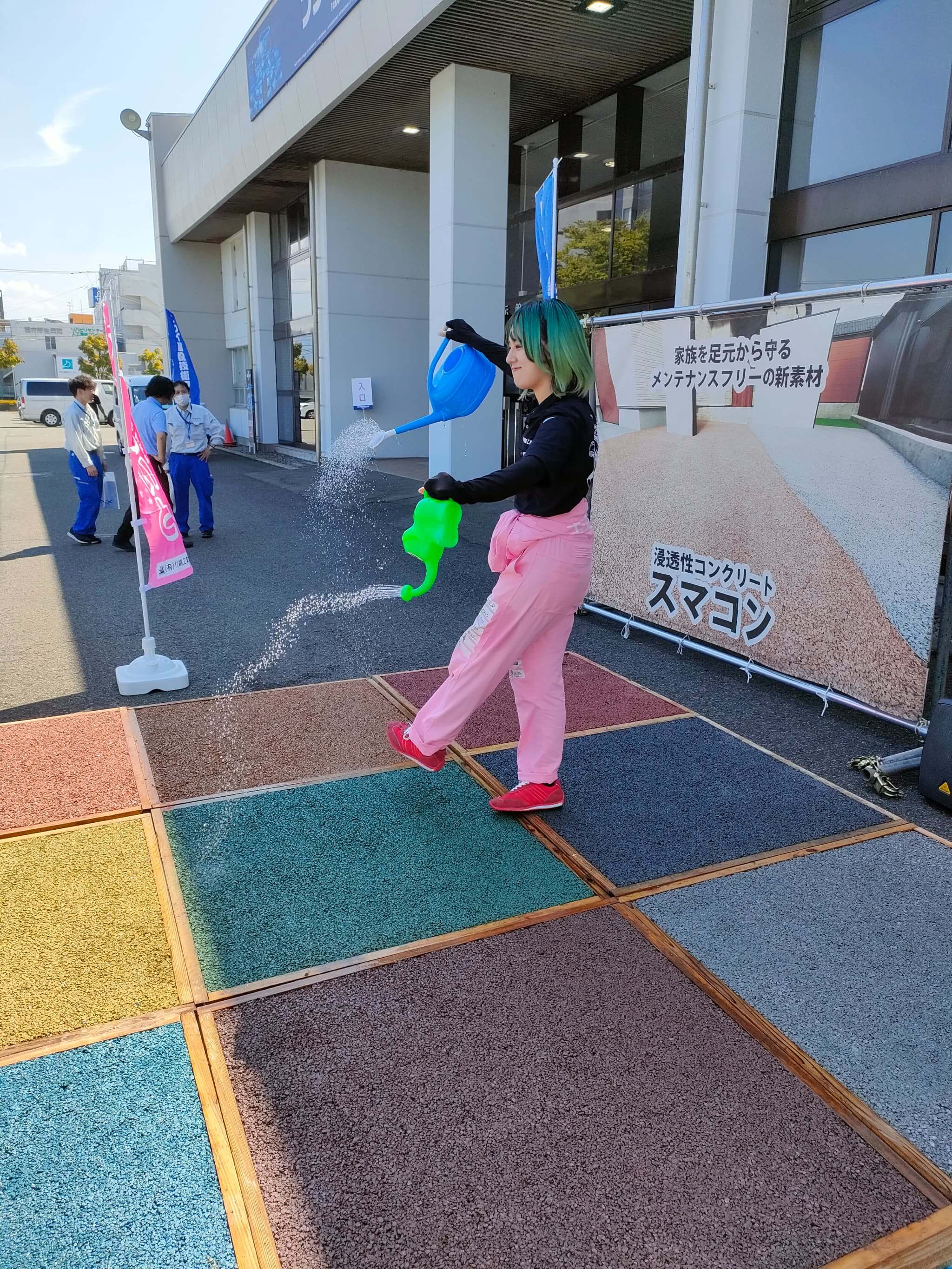 暑い中、透水性コンクリートに水を撒いて、水が溜まらないのを実演してました♪ 今日は、川端工業さんの作業服を着てたので、ぶっちゃけ、さくらいとが川端工業さんの社員さんかと勘違いしてる人もいましたw あと、追っかけなファンの方は昨日より増えてましたwww
