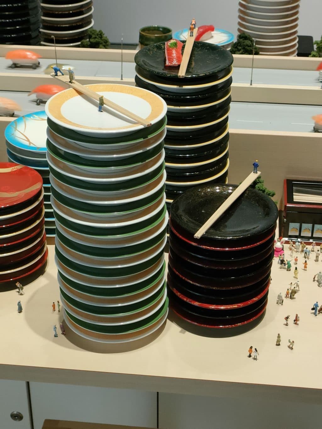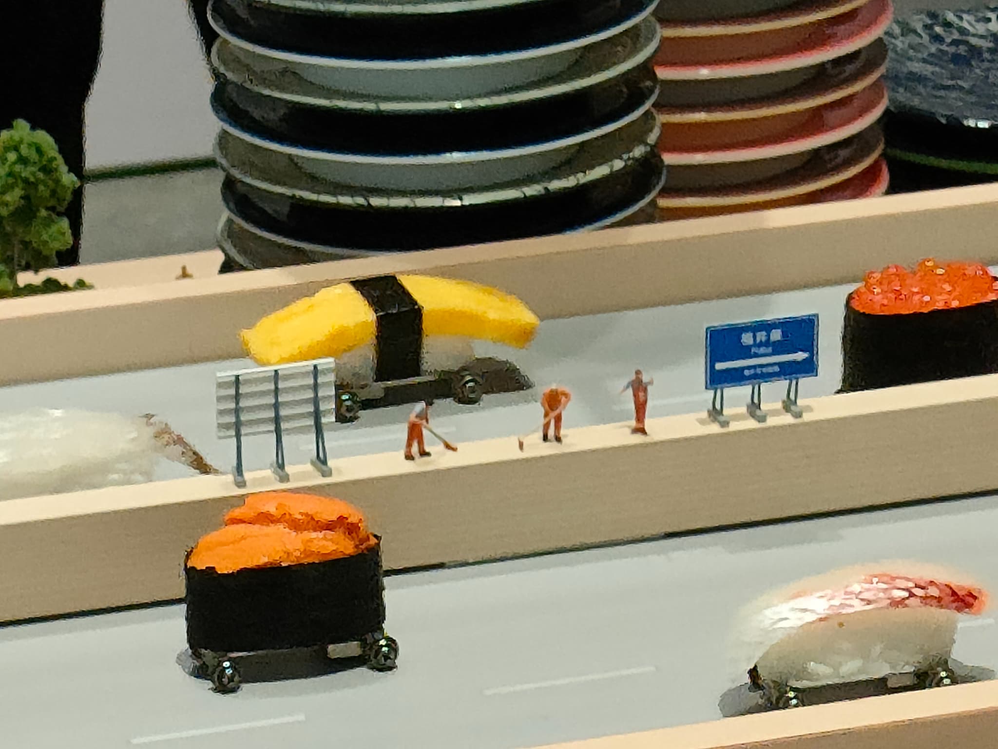 高速道路をデザインしているのですが、動画をご覧いただけるとわかるように、車線によって速度が微妙にちがってて、車に見立てた「にぎりずし」がまるで車のように見えます。