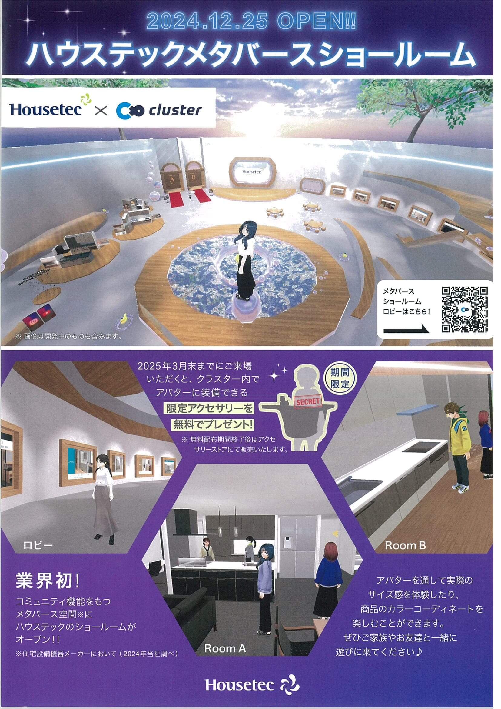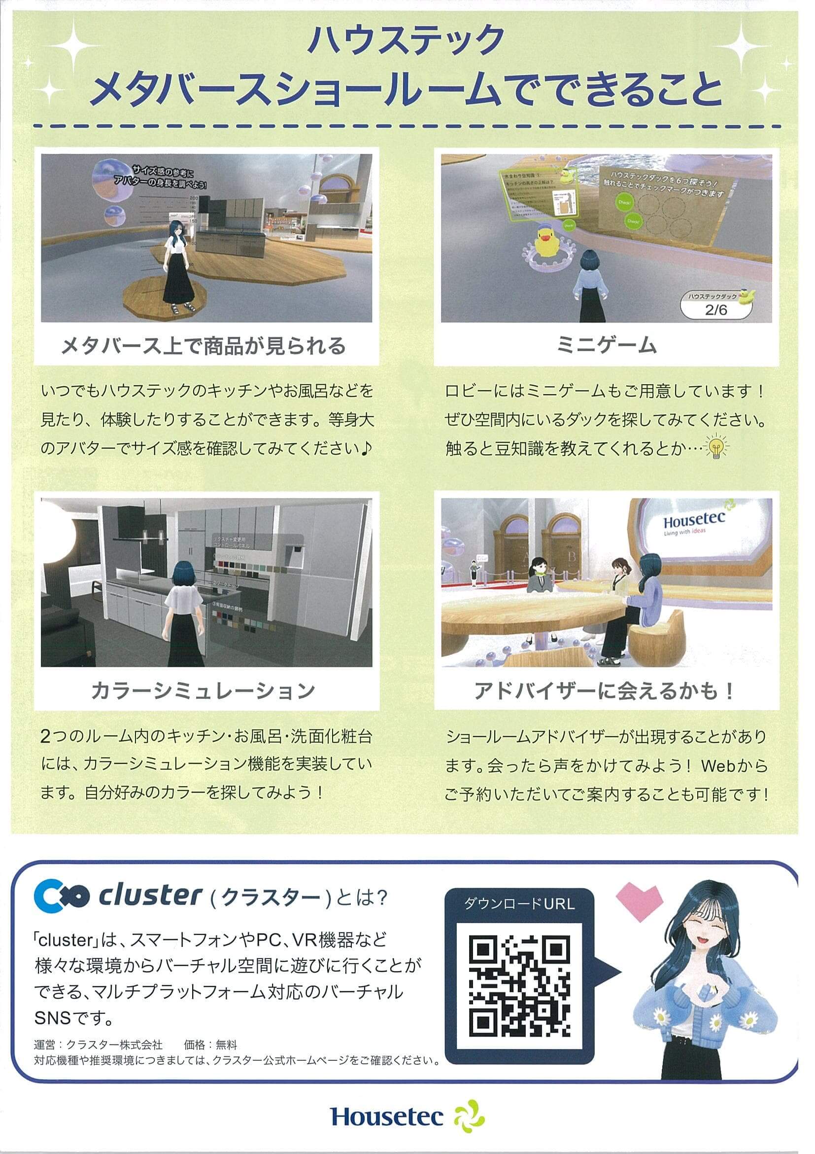 さて、「ハウステック」さんのメタバースショールームですが、clusterでアカウントをつくり、アプリをインストールして使用します。
