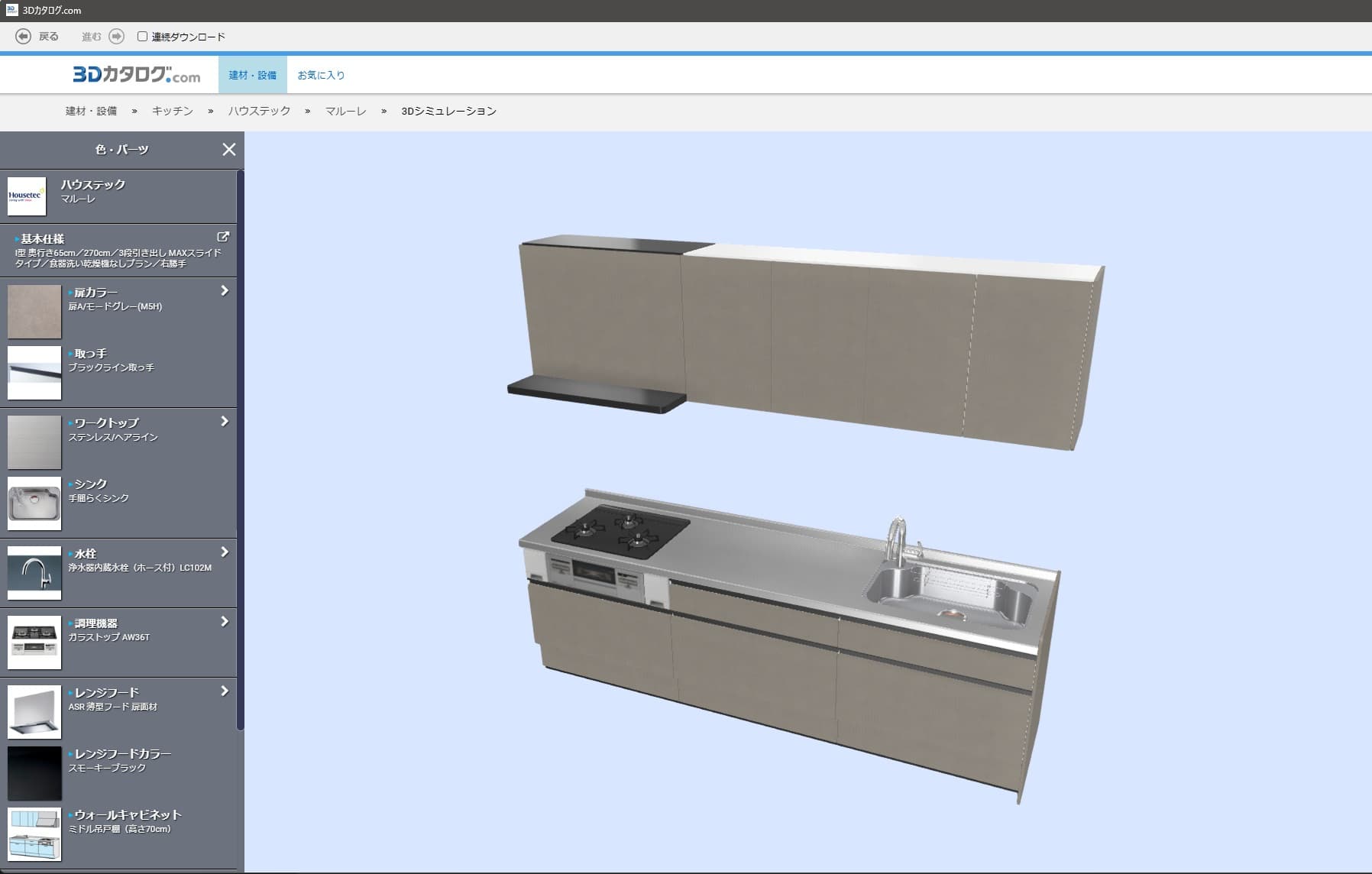 LDKをイメージした空間にハウステックのシステムキッチンと収納、また、洗面化粧台とシステムバスのデータが設置されています。先ほど「大きさの体感」と書きましたが、それに加え、「色彩の体感」もできます。できないことは、形状や付属仕様を変更することです。