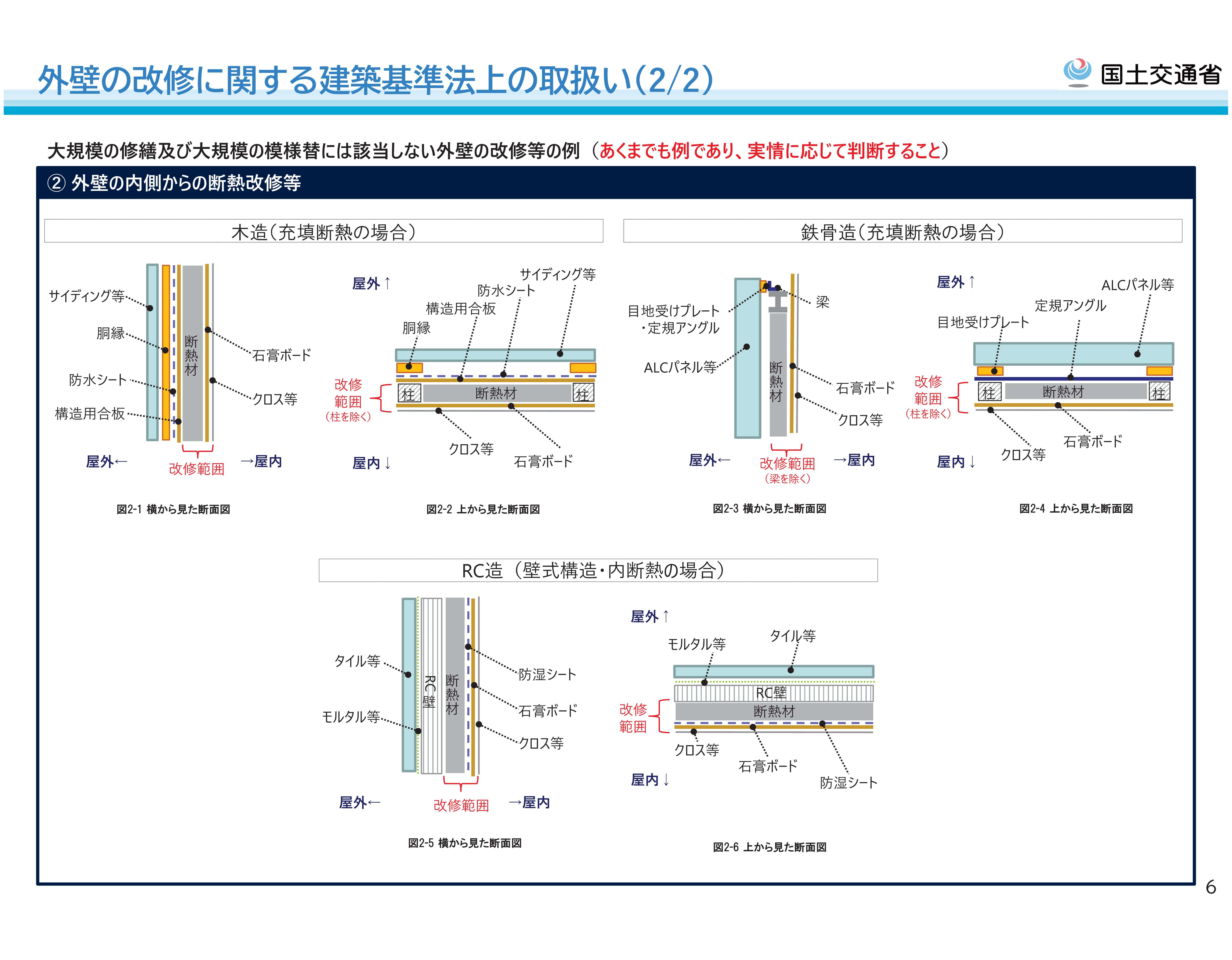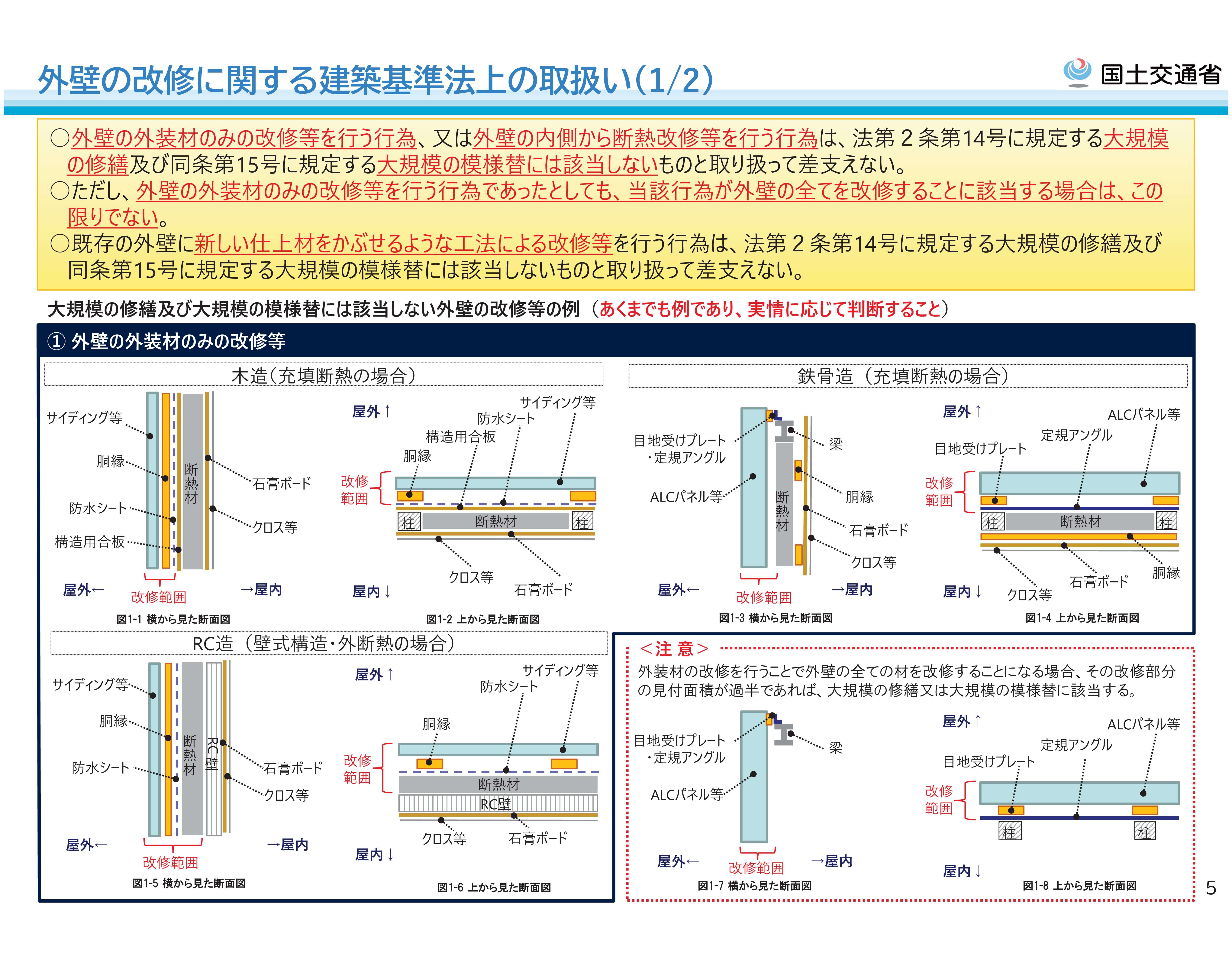 以下の画像は、リフォーム工事における「施工ケース」として、国交省が公開している改正基準法上の取り扱いではどう考えるか?の説明資料です。