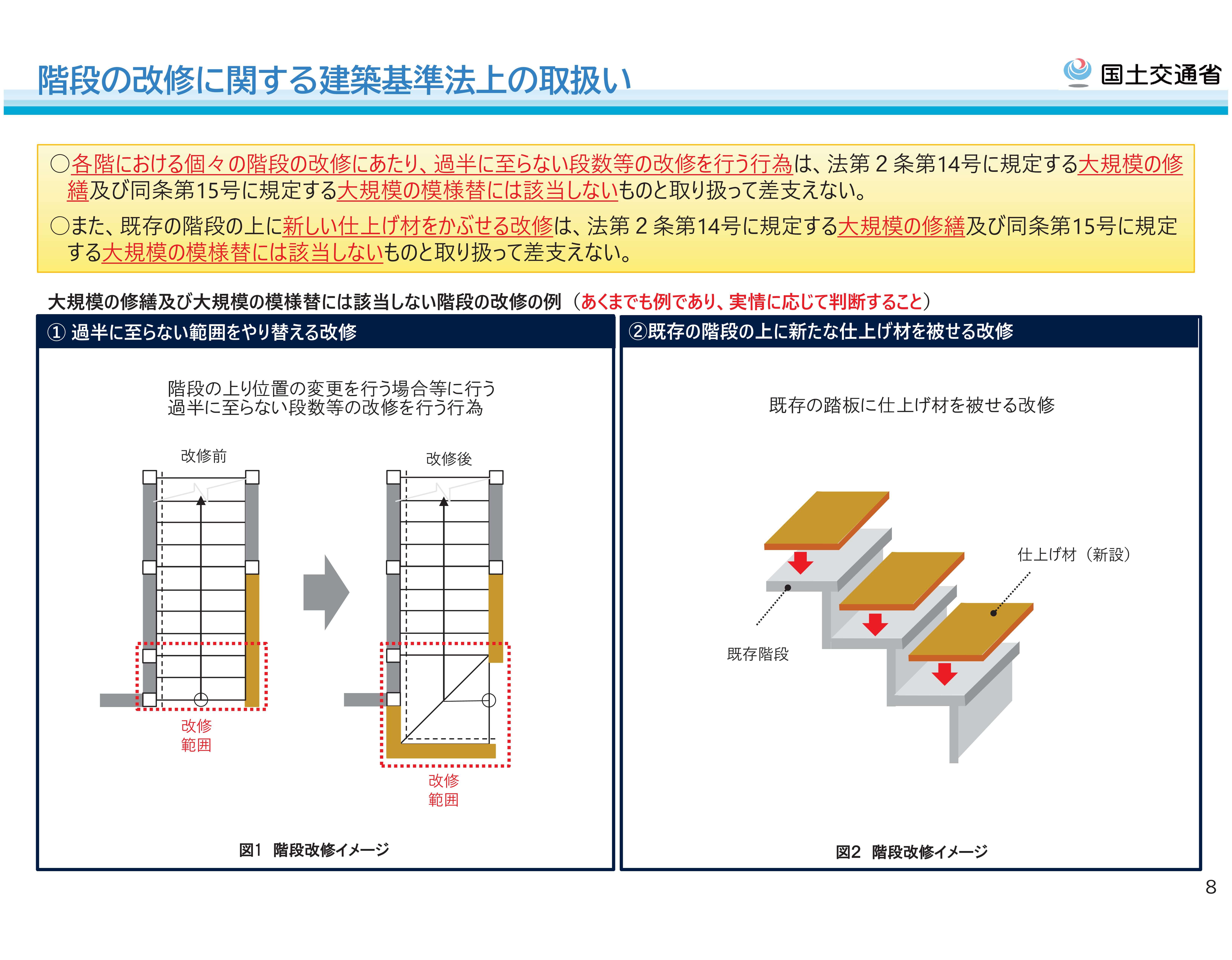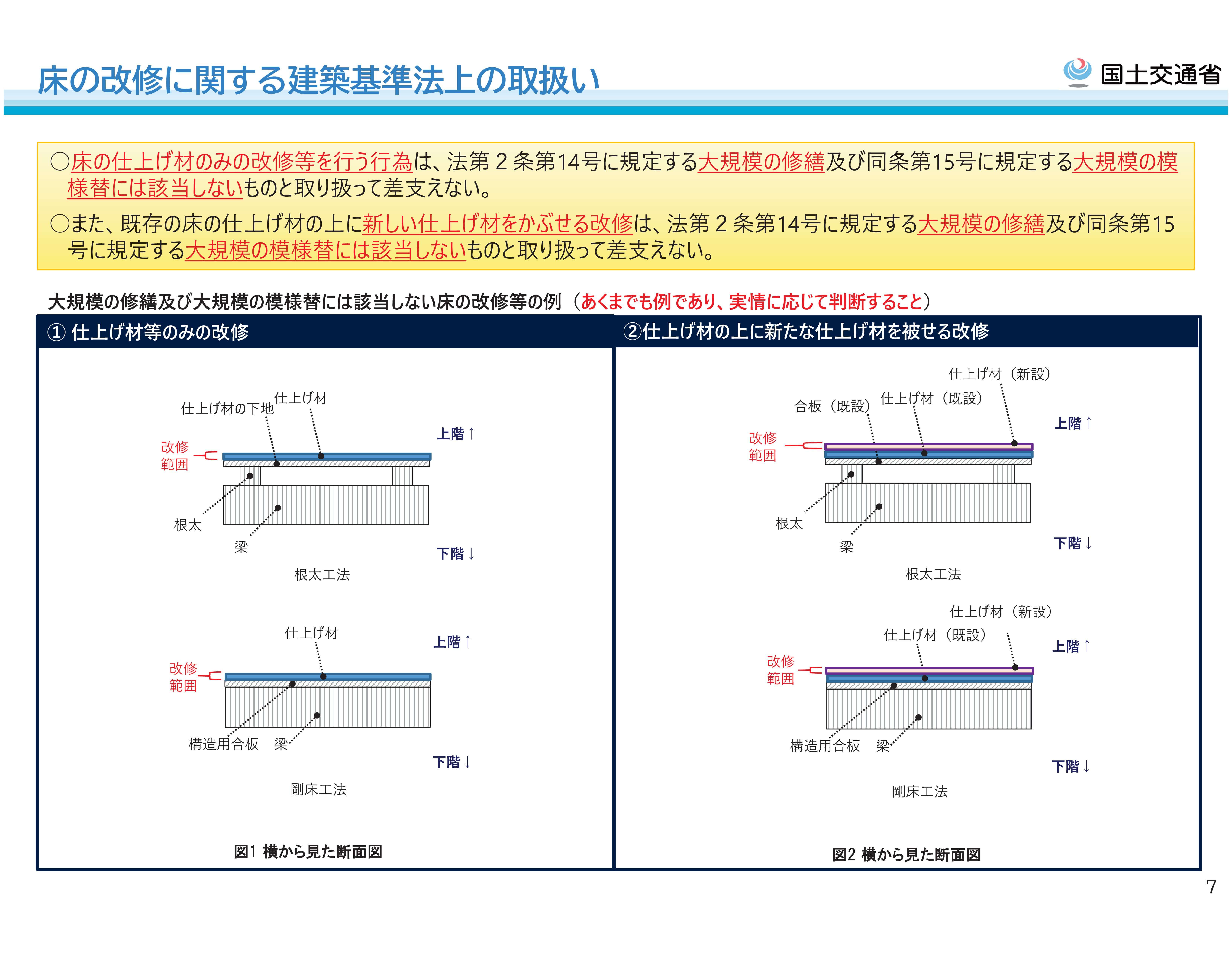 さて、国交省も改正にあたっての運用対応については様々な資料を出しており、周知に努めているようです。今回のブログでは、リフォーム工事等でよく用いられる手法について、それが「大規模な修繕」あるいは「大規模な模様替」にあたるかどうかを紹介したいと思います。