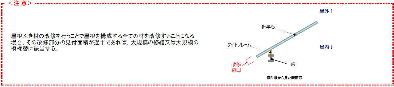 ただ、資料を読む限り以下のような注意書きがあることを参考にすれば、「屋根を構成する全ての材」を改修するわけではないので、「大規模な修繕」や「大規模な模様替」にはあたらないと考えてもよいかもしれません。