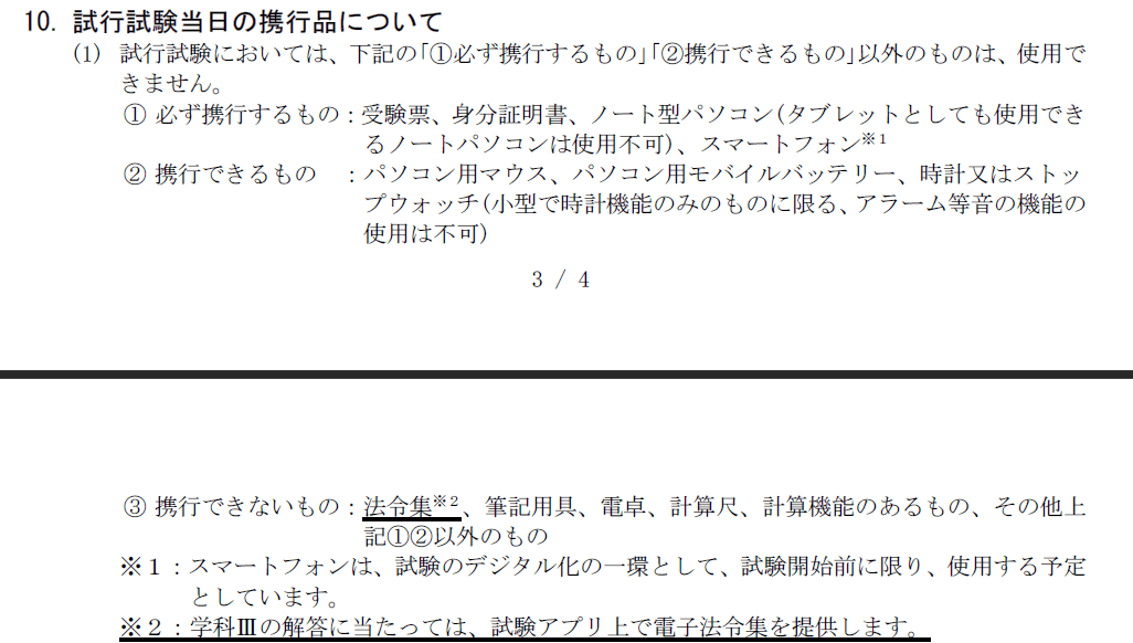 さらにマジかwwwって思うのはまだありますw 携行できるものというのが記載されてるんですが、携行できないもののリストになんと「法令集」がありますwww 筆記用具もダメですwww