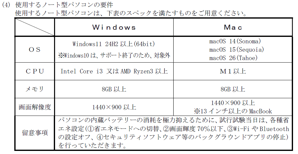 今日のPCは省電力を売りにしているものが多いですが、日常的に使っていればバッテリーの劣化は甚だしく、ACアダプターなしでの長時間運用はできませんwww しかも試験当日に省エネ設定を「強制」させられるようですので、輝度も落とすとなれば小さな画面での文字の判読が年寄りには厳しいかもしれませんwww