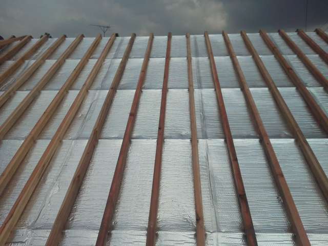 上棟(その2) SDN-SHEET 2012.06.01 屋根のSDN−SHEETの施工がほぼ完了しました。この時点で、すでに二階部分は涼しいです。この後は構造用合板を貼ってシージングボードを敷き詰めて本日の作業は終了の予定です。