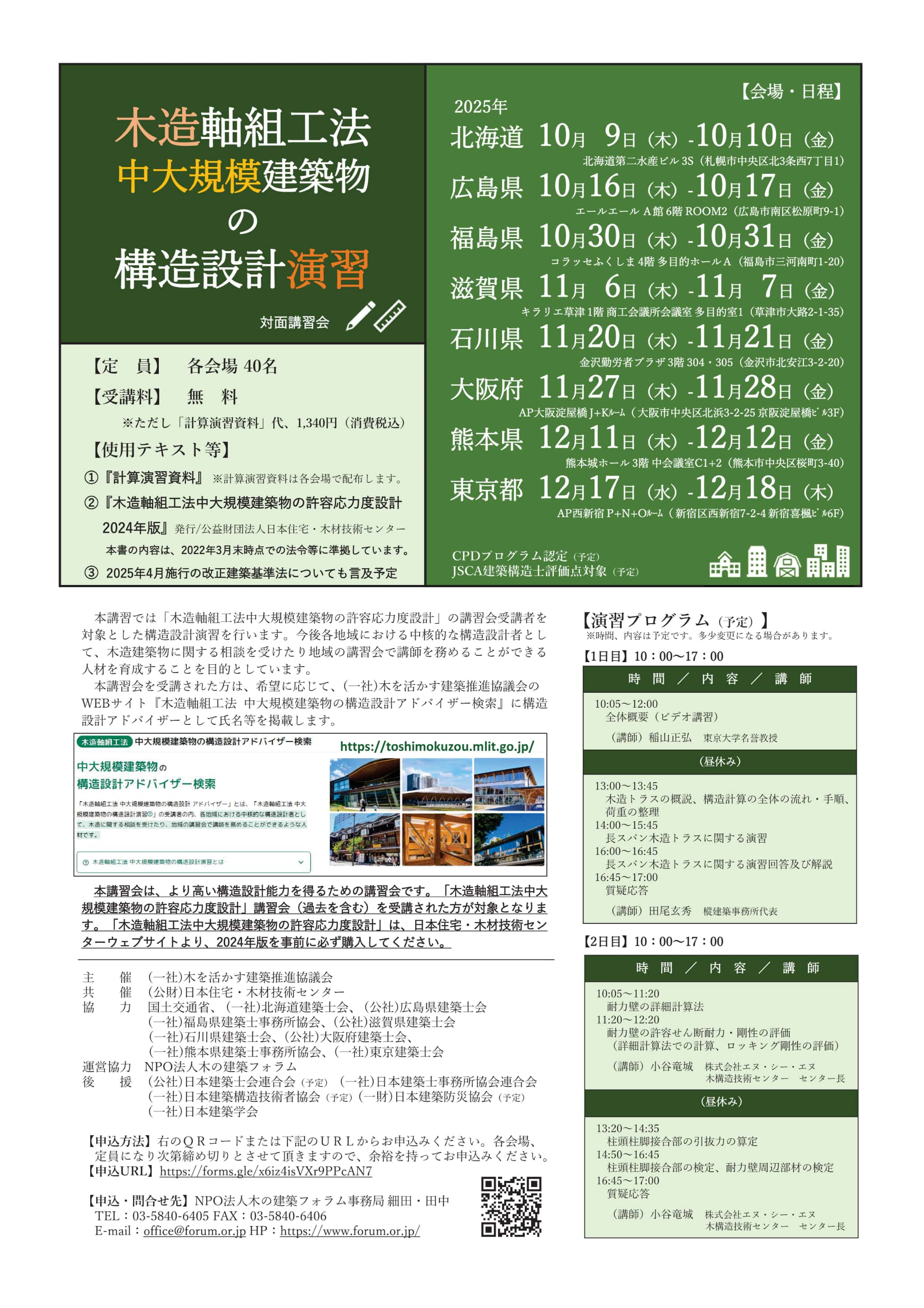 以前のブログでもご紹介しました「中大規模木造建築物の許容応力度設計WEBセミナー」ですが、1年ほどたって、2025年法改正に対応したセミナーとして再度開催されます。