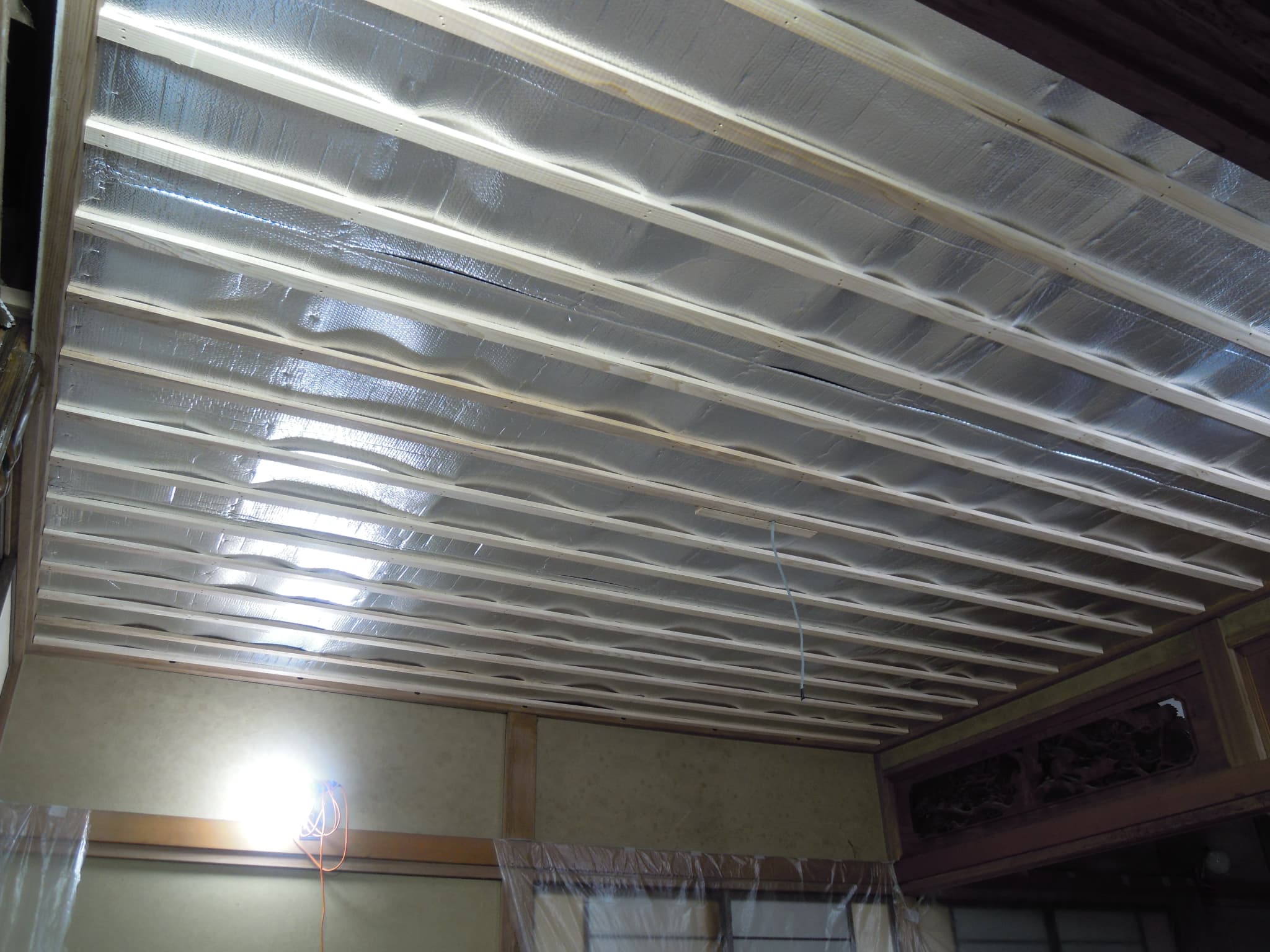 壁面を解体しての工事はコスト的に無理と判断し、天井面にSDN-SHEETを張り、熱を上階に逃がさないようにしました。また、設備機器の設置を行い、