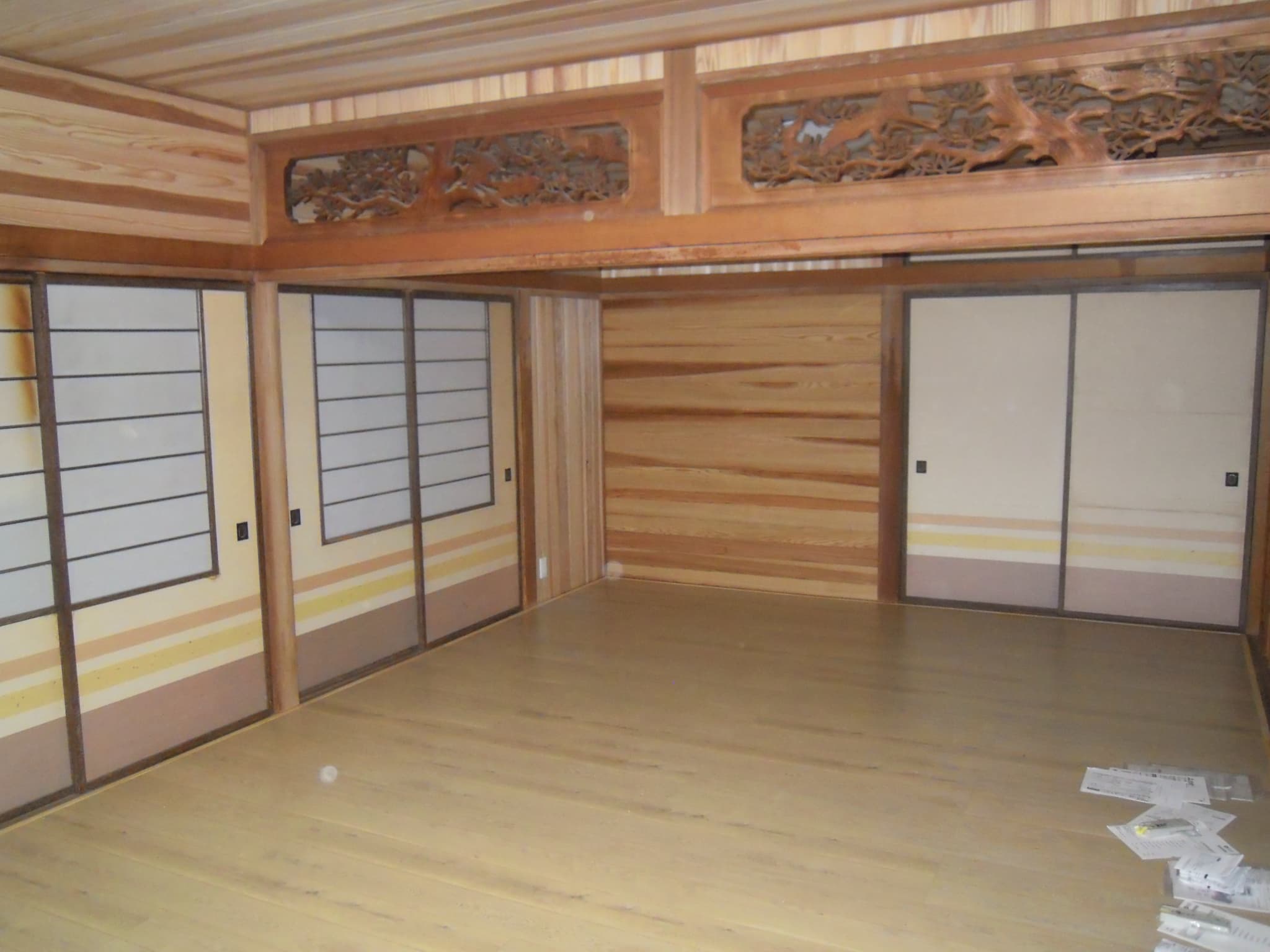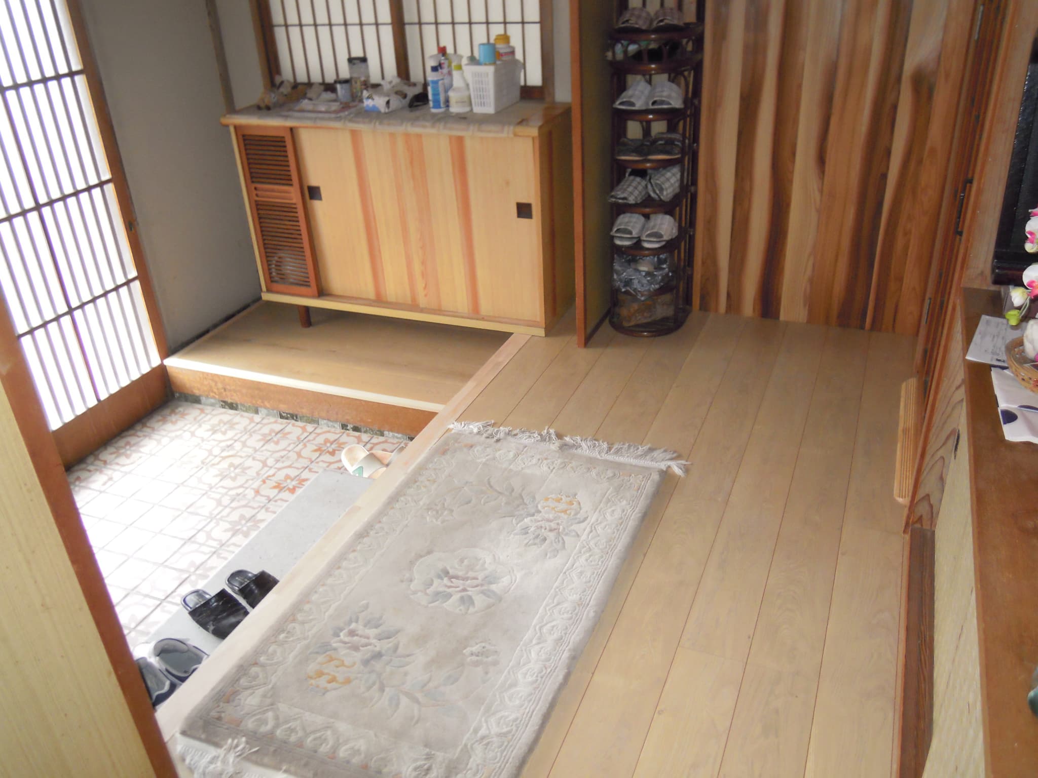 画像に見られるように、現状でもところどころに、段差解消を行うための「擦り付け板」の設置がございました。また、日常生活で動き回るであろう、同上の画像の床板の傷みがあり、合板床板特有の「ふわふわ」感もあったので、この床の上から床板を張り増しする形で床補強と、「擦り付け板」の勾配、厚みを薄くすることにいたしました。そうすることにより、既存和室への出入口の建具を取り換えるようなことをせずとも、段差を緩和することとしました。