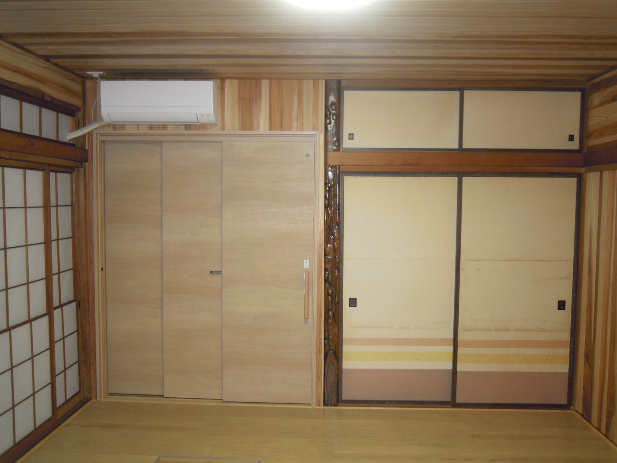 浴室・脱衣場に換気暖房乾燥機を、和室であったところは、2部屋の広さをカバーできるエアコンを設置しました。