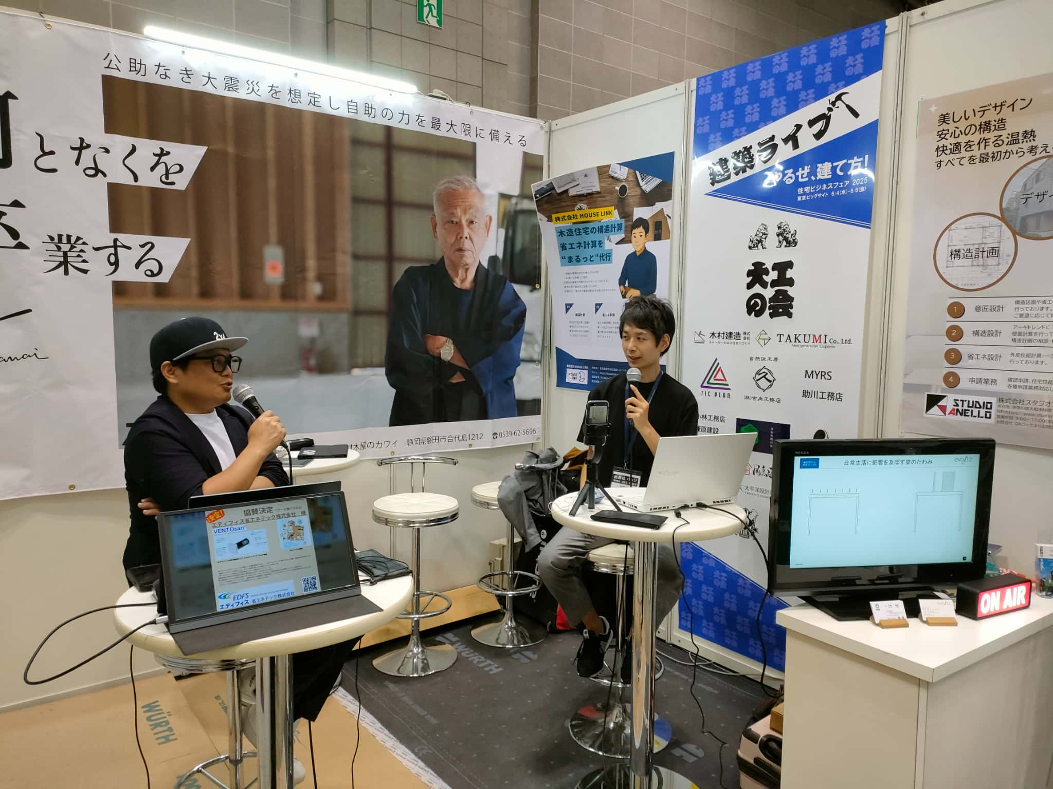 さて、今回の展示会ですが、以前も弊社のラジオコーナーの「福登建設の快適家づくり研究所」でゲスト出演したいただいた、ツーバイマンヒロキこと戸鳴宏樹先生が、これまた「家コミュ関東」を主宰している早川浩平先生とタッグを組んでブースから生配信も含め情報発信していくということで出展なさいました。