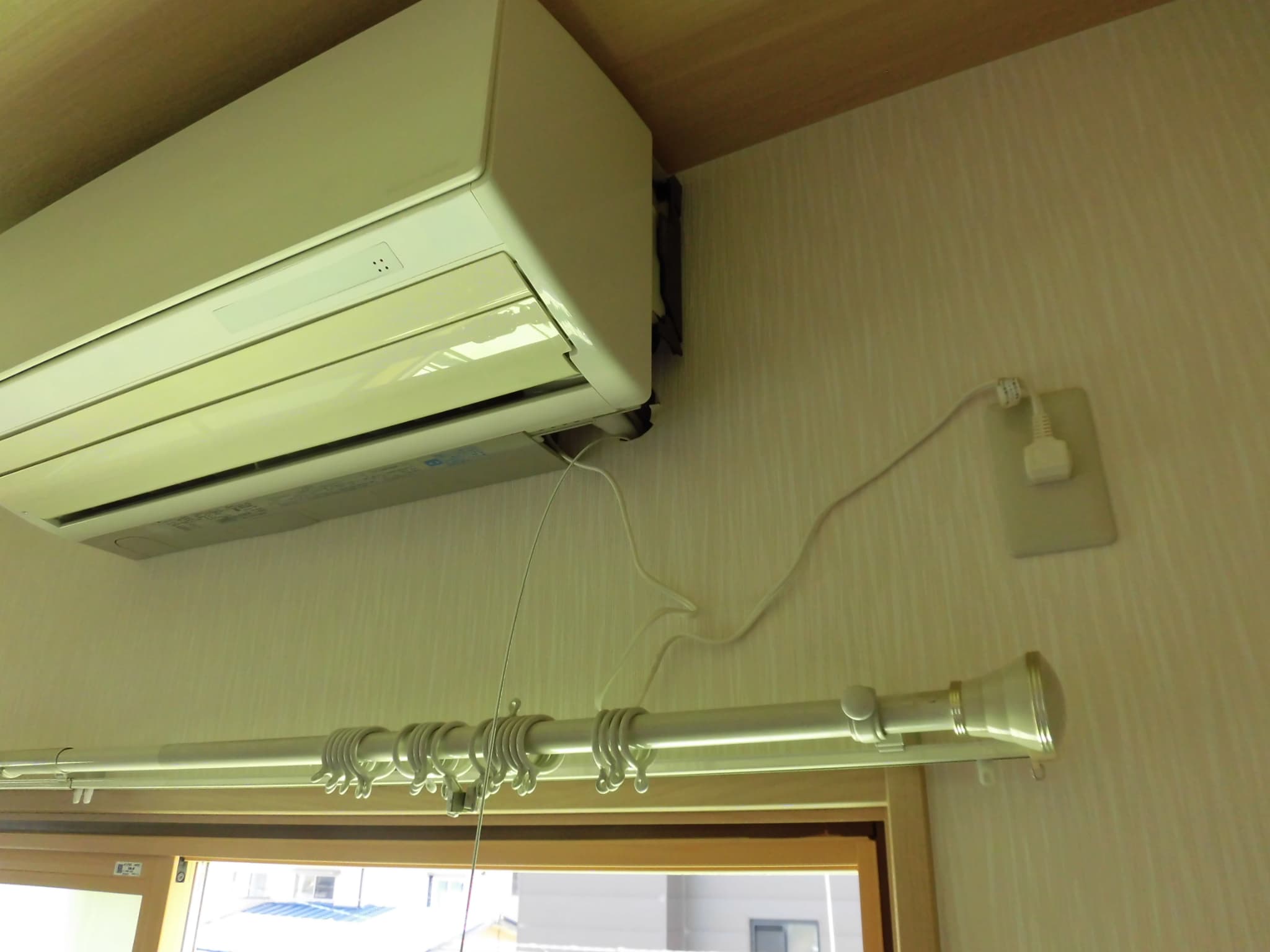 実は、光通信ケーブルは、なんと、エアコンの冷媒配管を通した孔をつかって導入されています。こういった事例は当たり前になされているようでして、「通信できていれば問題ない」という考えからだと思います。グラスファイバーの線なのに、アンテナ線や電線と同じ扱いなわけです(泣)。となれば、エアコンの取替えなどで冷媒配管を引き抜いたり、また、エアコン室内機を設置したりする際に、この光通信ケーブルに確実に干渉してしまいます。もちろん、そーっと、エアコンの配管を入れたり、室内機を設置したりして、光通信ケーブルがほとんど動かないように作業すれば問題ないかもしれません。でも、そんなにうまくいくわけがないのです。