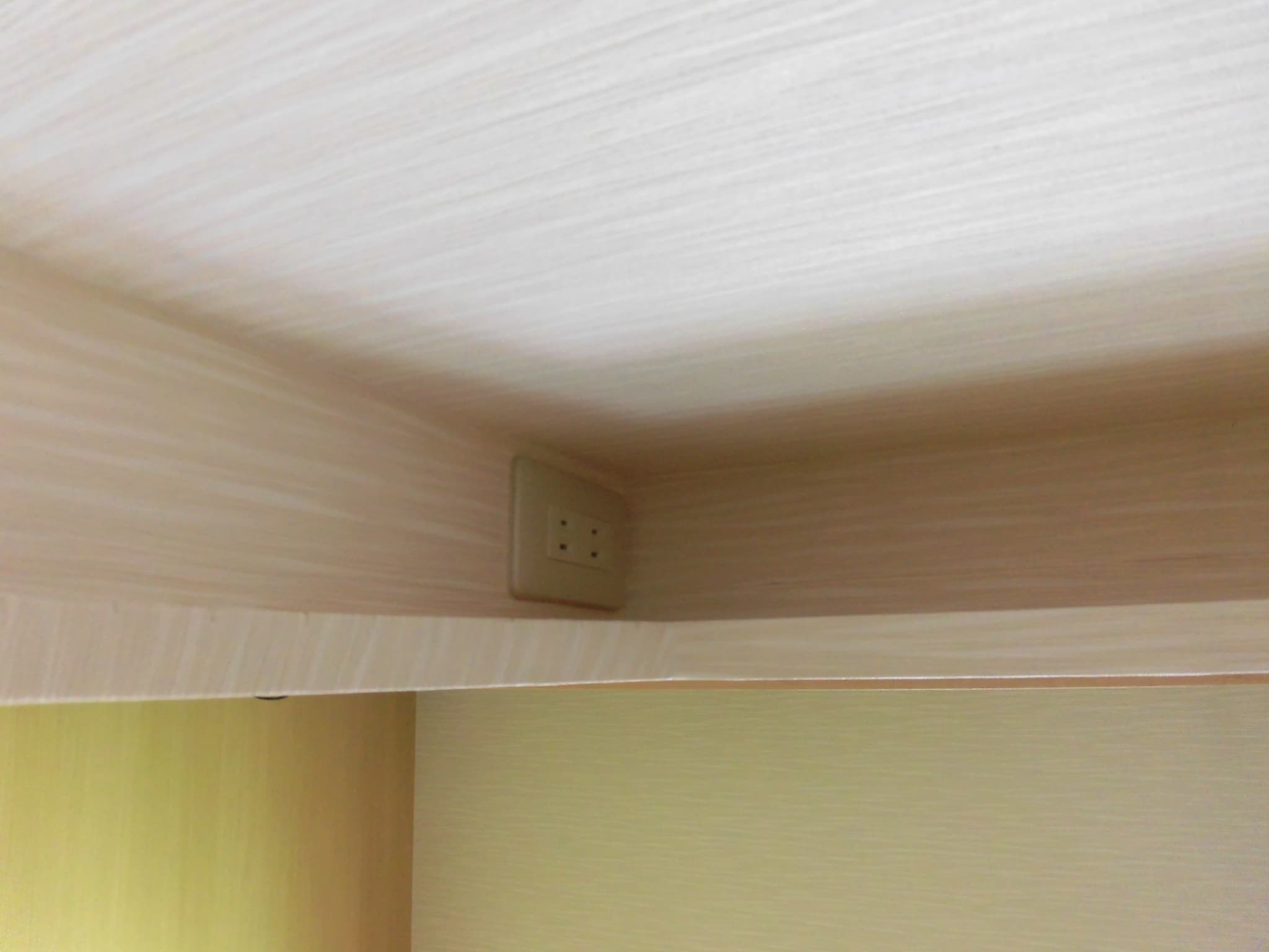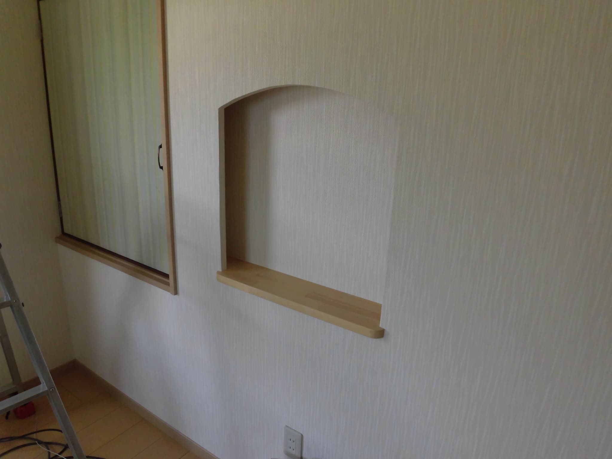 さて、実は今回の改修では、光通信のための「ONU」やルーターを設置する棚をニッチをつくって準備してあります。隠れたところに電源コンセントも設置して、見た目をすっきりさせてます。本来、新築であれば、このコンセントの近くにCD管やPF管を配置するのですが、それができなかったことが今回の事故を招いたとも言えます。今後の改修では、先に光通信ケーブルの引き回しを確実に改修してからにしようと思います。