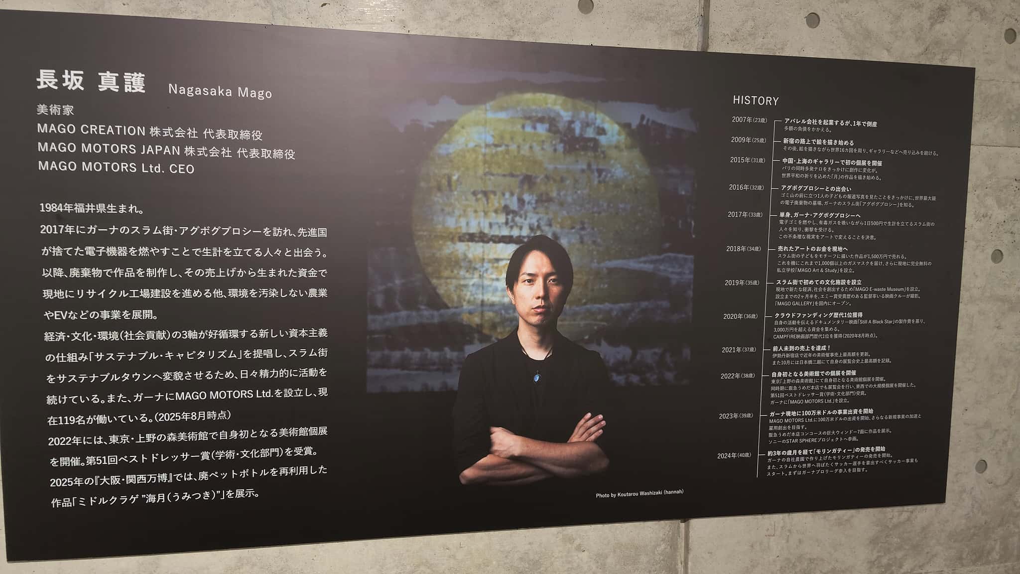 展示はすべて写真撮影可ということでした。アフリカ、ガーナのスラム街「アグボグブロシー」に行かれて、「電子のゴミ山」で生活のためにそのゴミを燃やし生計を立てていることを知ったそうです。先進国といわれる国々の産業廃棄物である「電子機器」を、有害物質が発生することも知らずに燃やし、そして生活の糧にする、それも幼い子供たちまでもがやっていることをご覧になって「世界の不条理」を痛感したそうです。