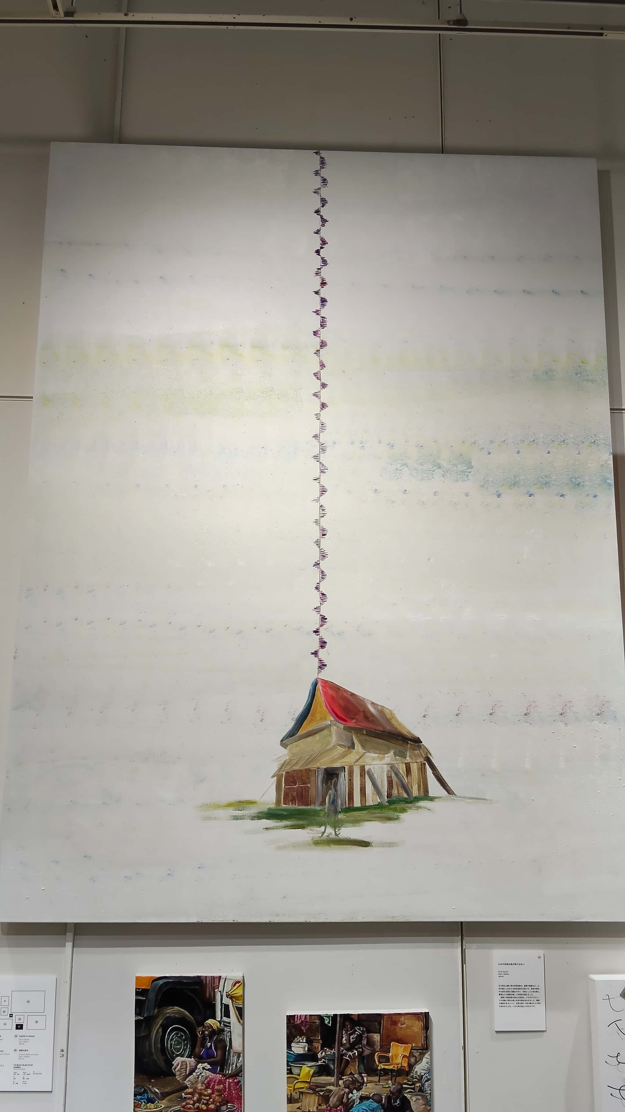 ひとつは「the Skum in the hope」というタイトルです。スラム街に佇む少女を描いたものでしょうが、この子供たちの存在が「希望」であり、社会がよくなっていく原動力だということなのでしょう。また、もう一枚は、ちょっとタイトルがわからなかったのですが、螺旋階段が家から雲の上に向かっていく様子を描いたもので、今の劣悪な社会環境から脱却するという意思の表れだと感じました。おそらく、長坂さん自身がガーナで様々な活動をしていることで感じていることとして、誰かに与えられることよりも、自らがつかみ取りにいくということをガーナの人たちに伝えたいのでは?と感じました。