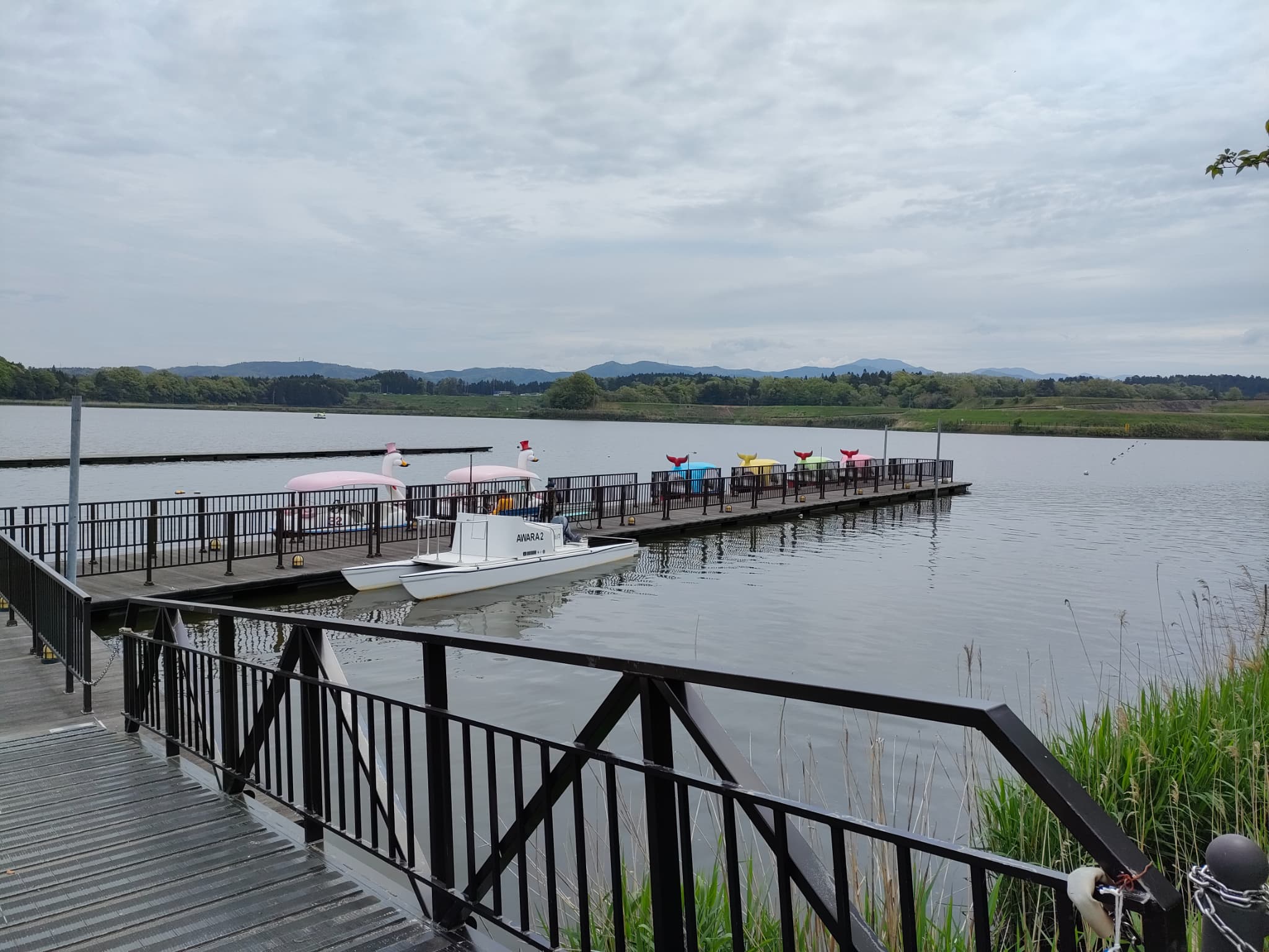 そして、湖を望むところには桟橋があり、北陸では珍しいスワンボートのレンタルもできます。大人数で乗るボートもあって、みんなで協力してペダルを漕ぎ湖を周回しますが、これが意外と足にきますwww