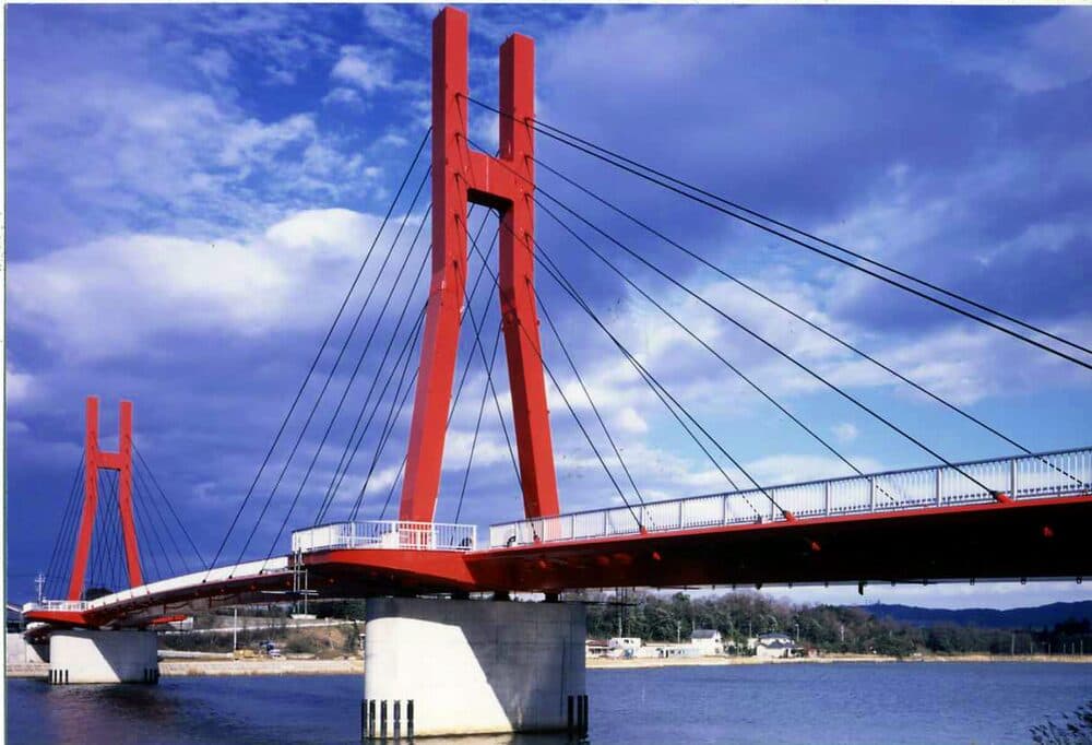 吉崎御坊から北潟湖湖畔の北岸沿いを走るルートで、左手に「アイリスブリッジ」という橋がみえてきます。赤色が青空に映えるスポットで、晴れた日にこの橋を渡って付近を散策するとすごく気持ちがいいです。