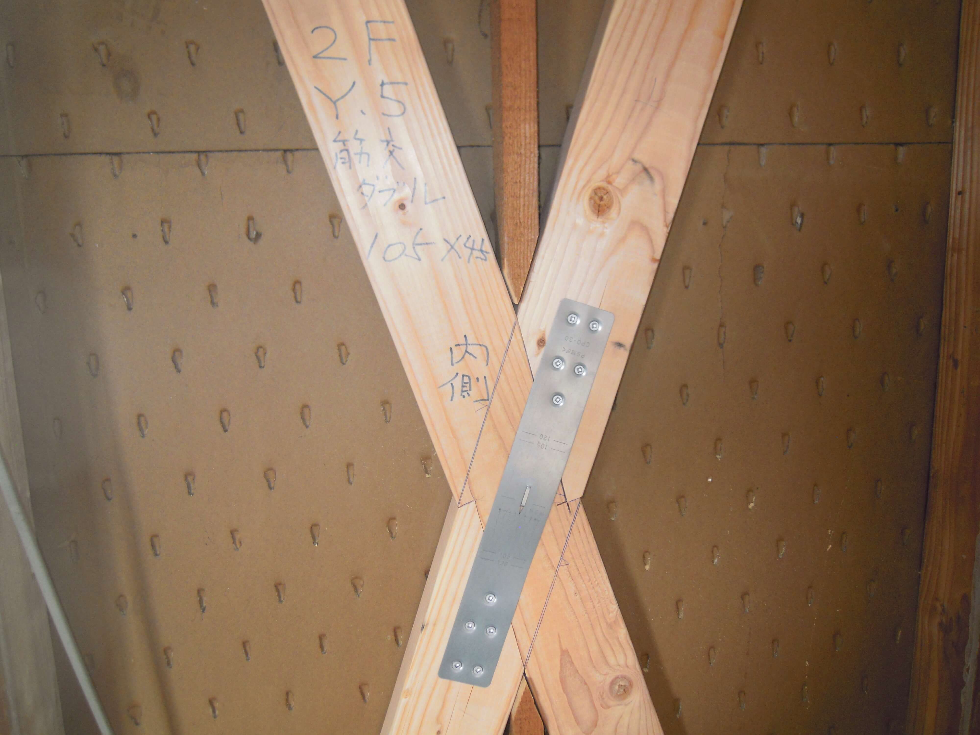 また、古い建物の場合、和室の設えが多く、抜本的な耐力壁を設ける場合には、真壁の部分に筋交いを配置する必要も出てきて、その際にはたすき掛けの筋交いを相掛けにする必要がでてきます。このとき、相掛けした部分については、表裏両面に金物による補強を施さなければ、たすき掛けの筋交いとして耐力があるとは認められません。