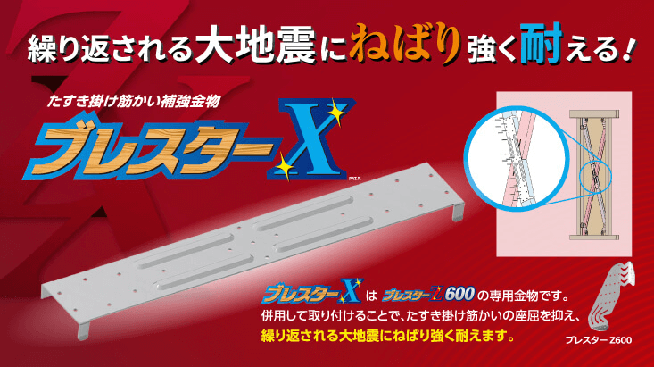 以前も使用したことがあるのですが、筋交い金物もセットで使うことが要求されることから、筋交い金物である、ブレスターZ600が確実に納まるか?というのがクリアできる条件になります。今回、それができると判断できましたので使うわけですが、それがわかったのが解体直後であり、工事の日数も非常に限られていることもあって、このブレスターXとZ600の納期が問題でありました。