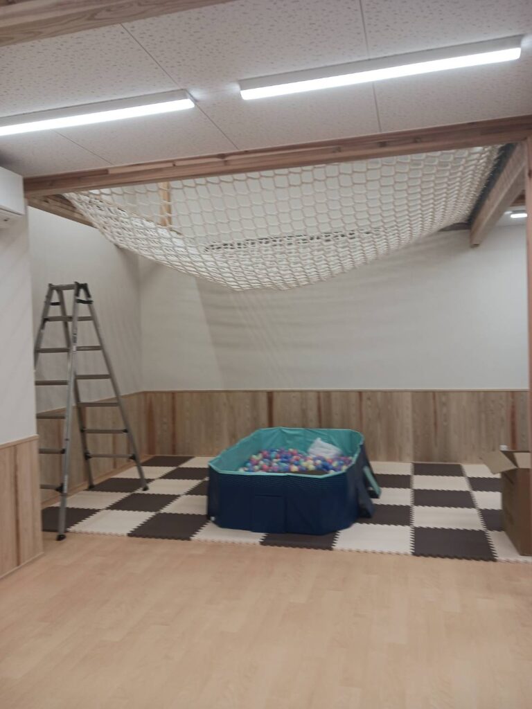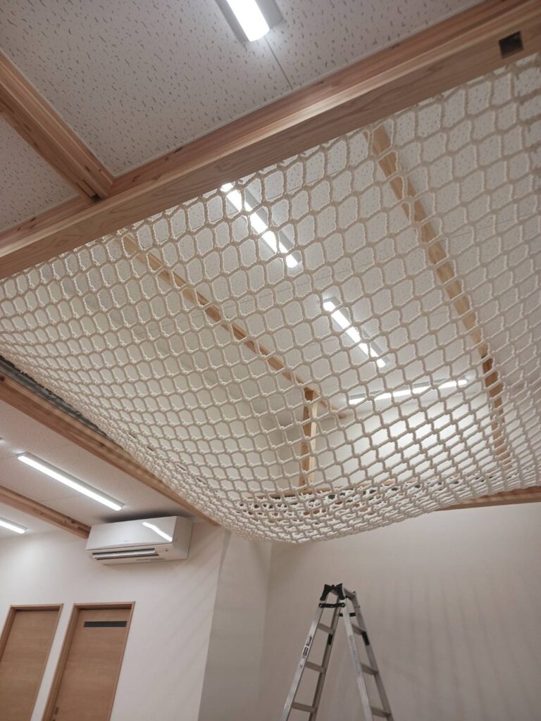 先般、設計施工にて新築させていただきました「児童福祉施設」で、吹抜け部分に「アスレチック」のためのネットを取付ました。
