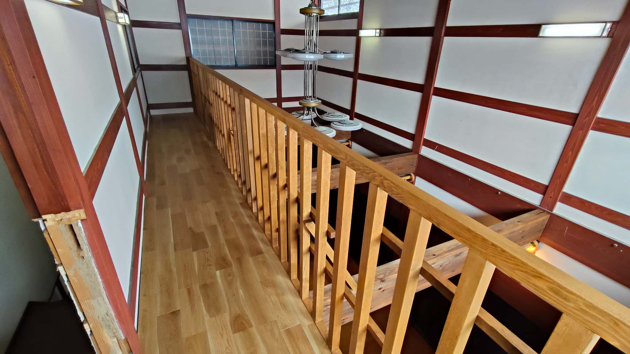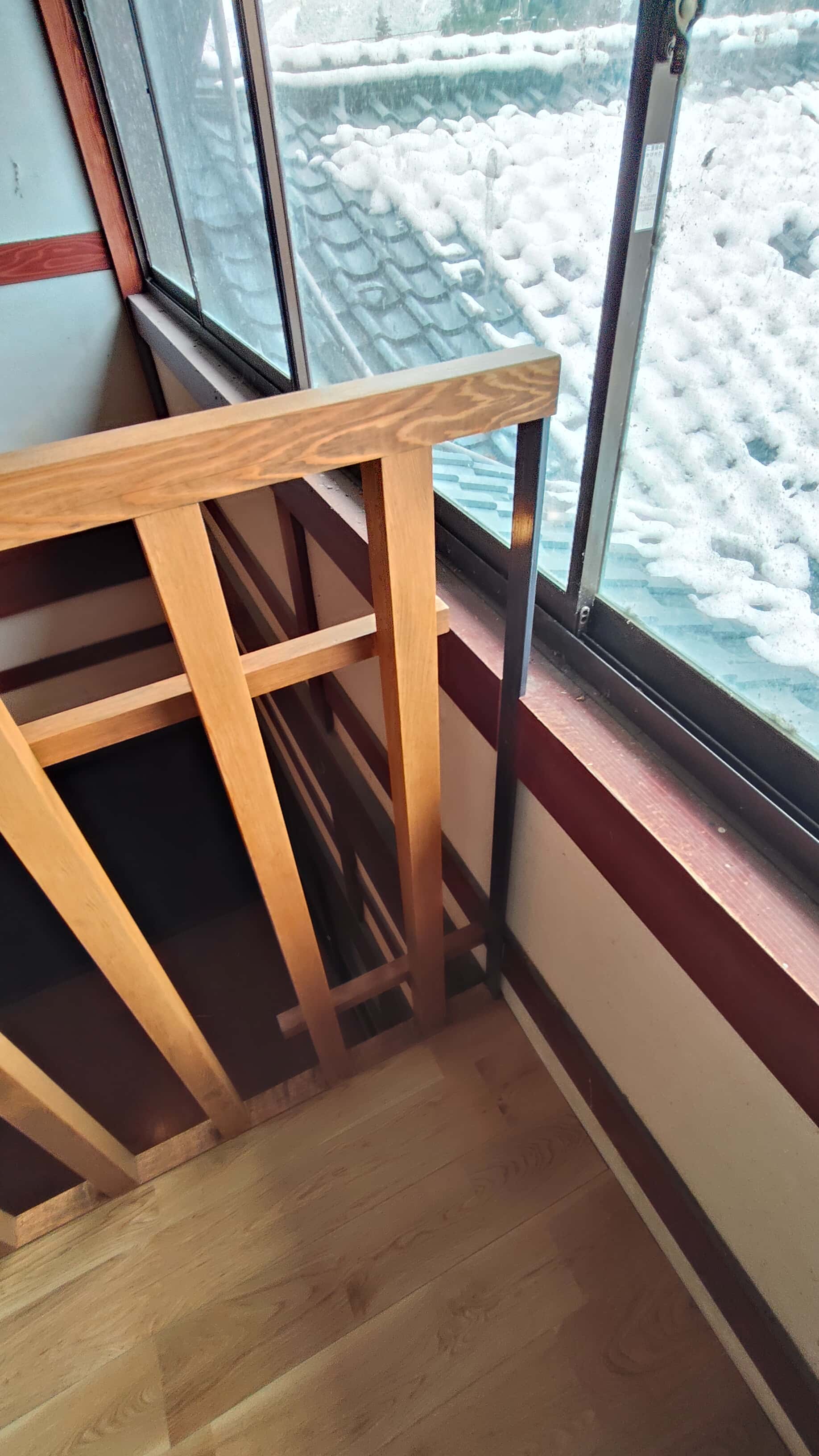 デザインとしては原設計と寸分狂わぬ施工ができましたが、やはり、高い意匠性を施工面で台無しにしないような工夫は重要です。画像でもわかるように、画像右側の手摺の終端処理は真壁の柱に飛びつく形で取付が可能なんですが、窓側の終端はちょっと工夫する必要がありました。