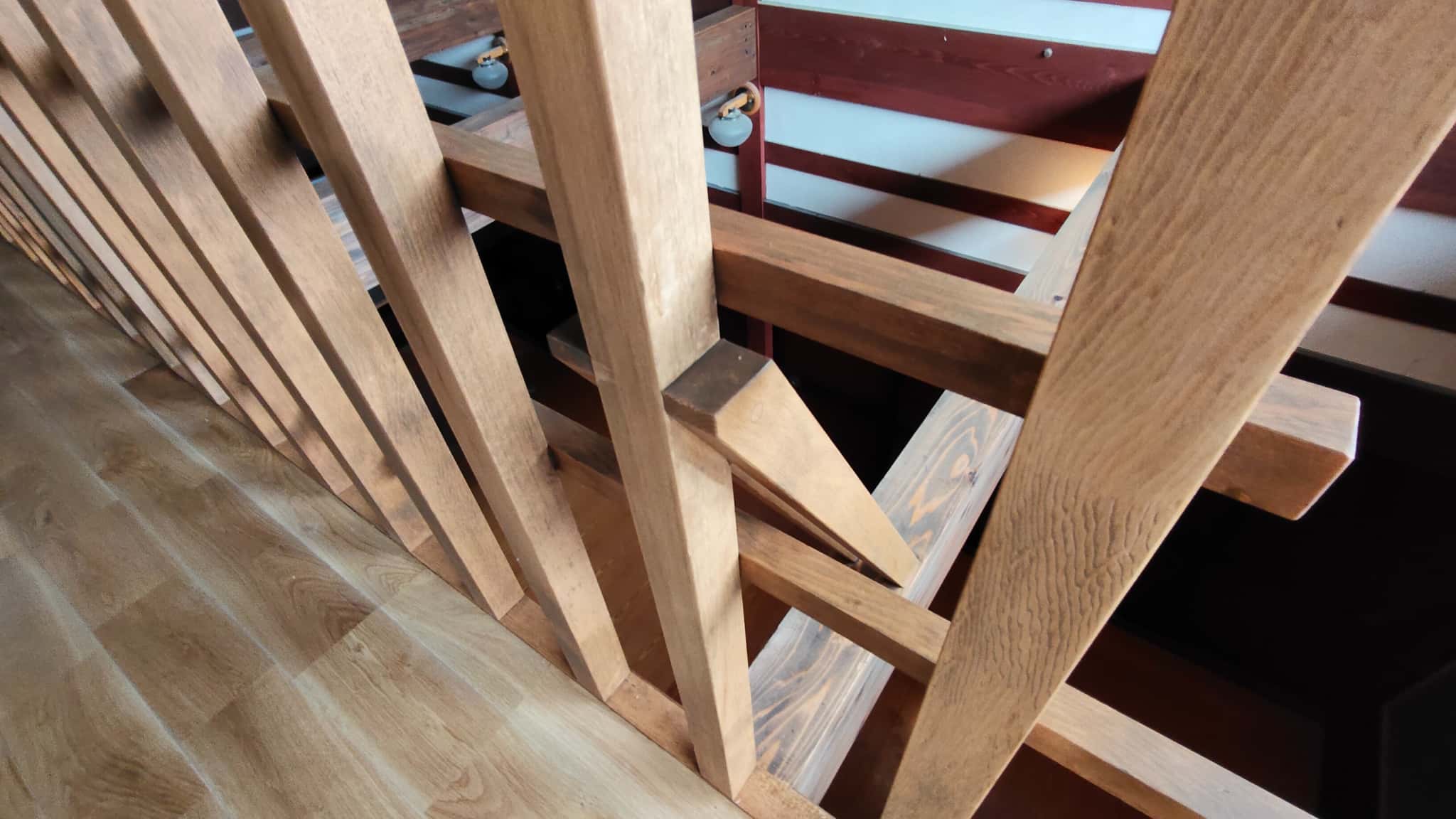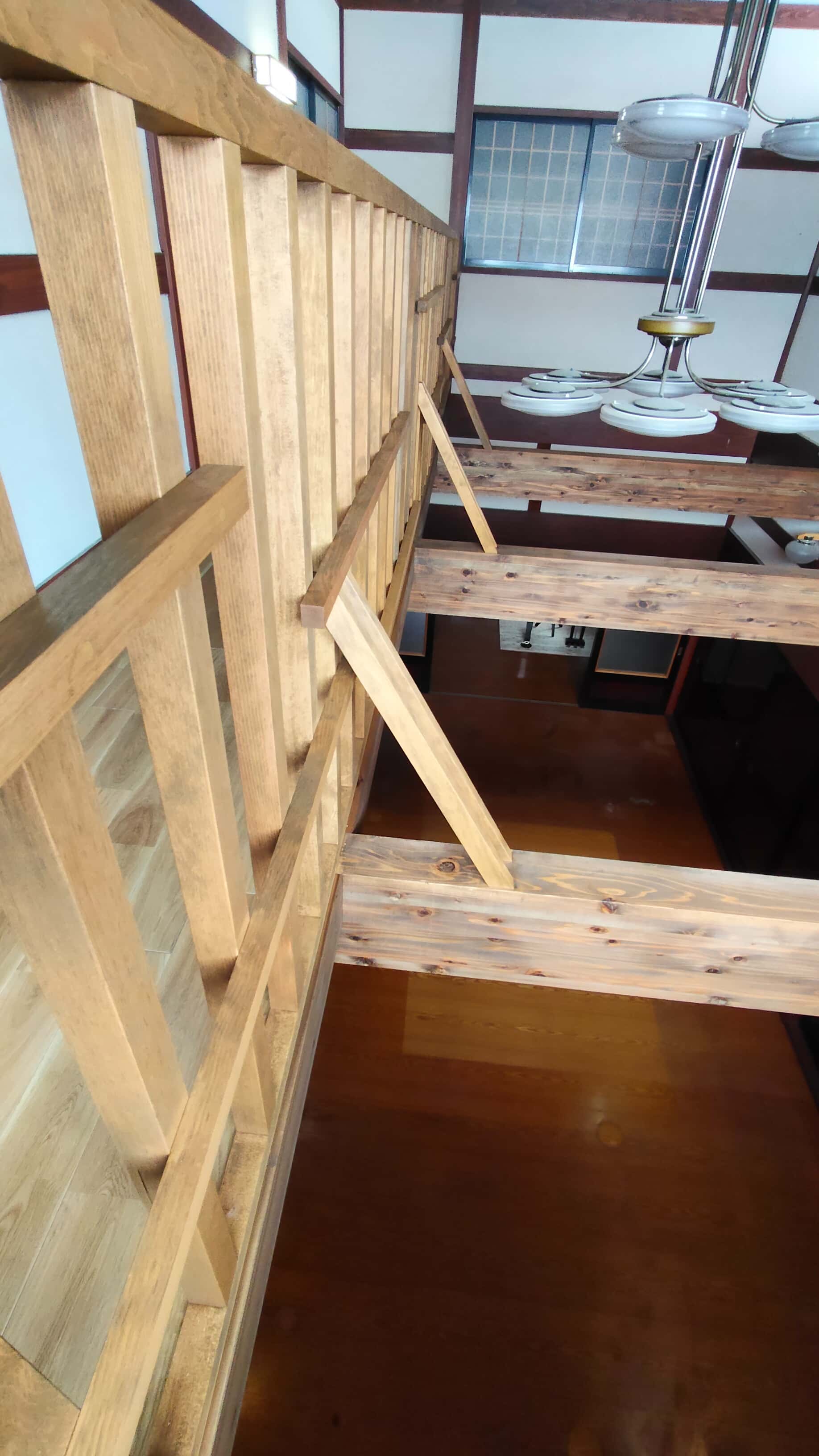 また、手摺の転倒を防止するために「梁」に「控えの方杖」を設置しております。