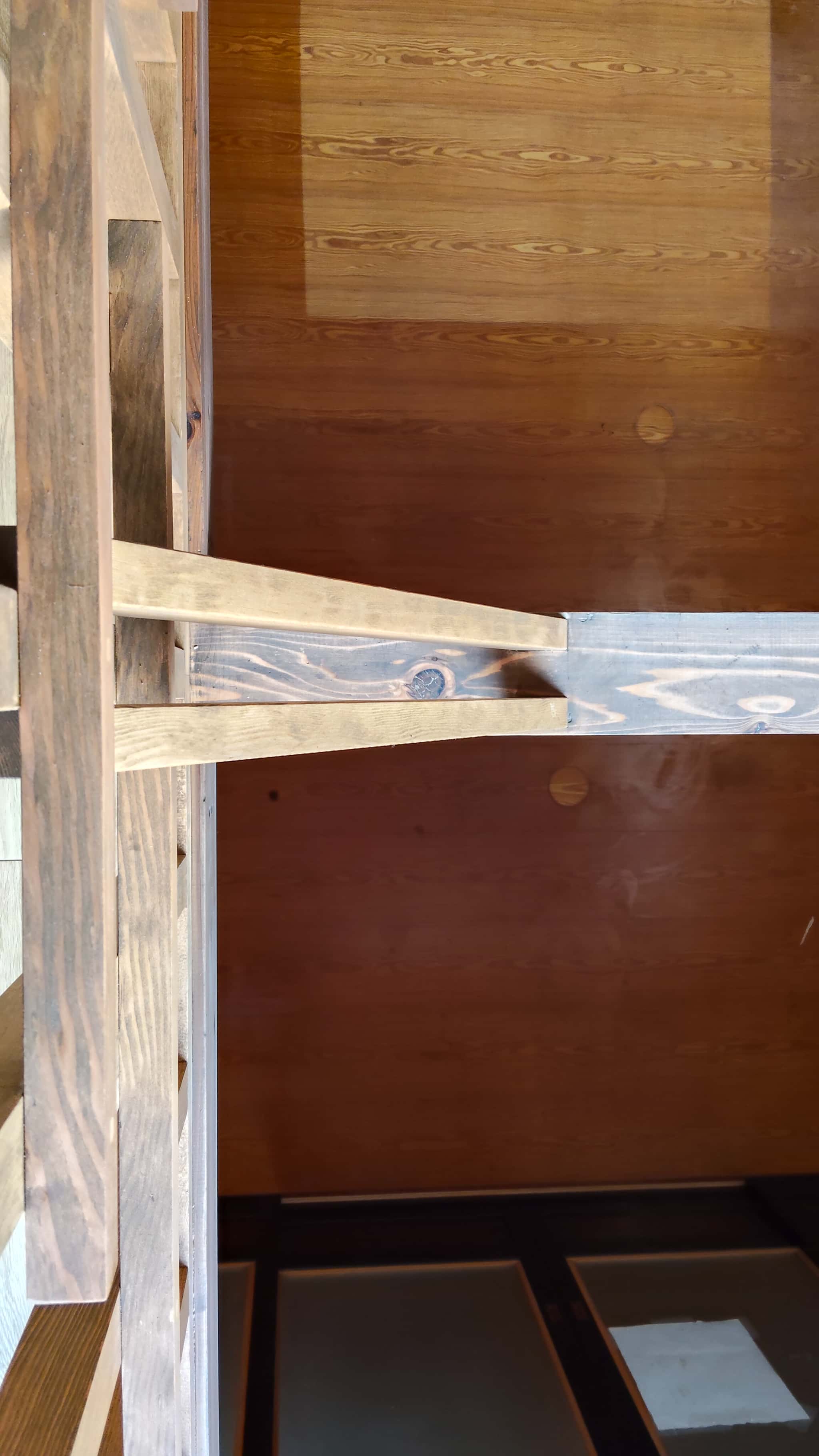 梁にはホゾを切ってせん断抵抗されていますが、さらに補強のためにビス止めにしています。ただし、ビスの頭を見せないように「埋木」してあります。