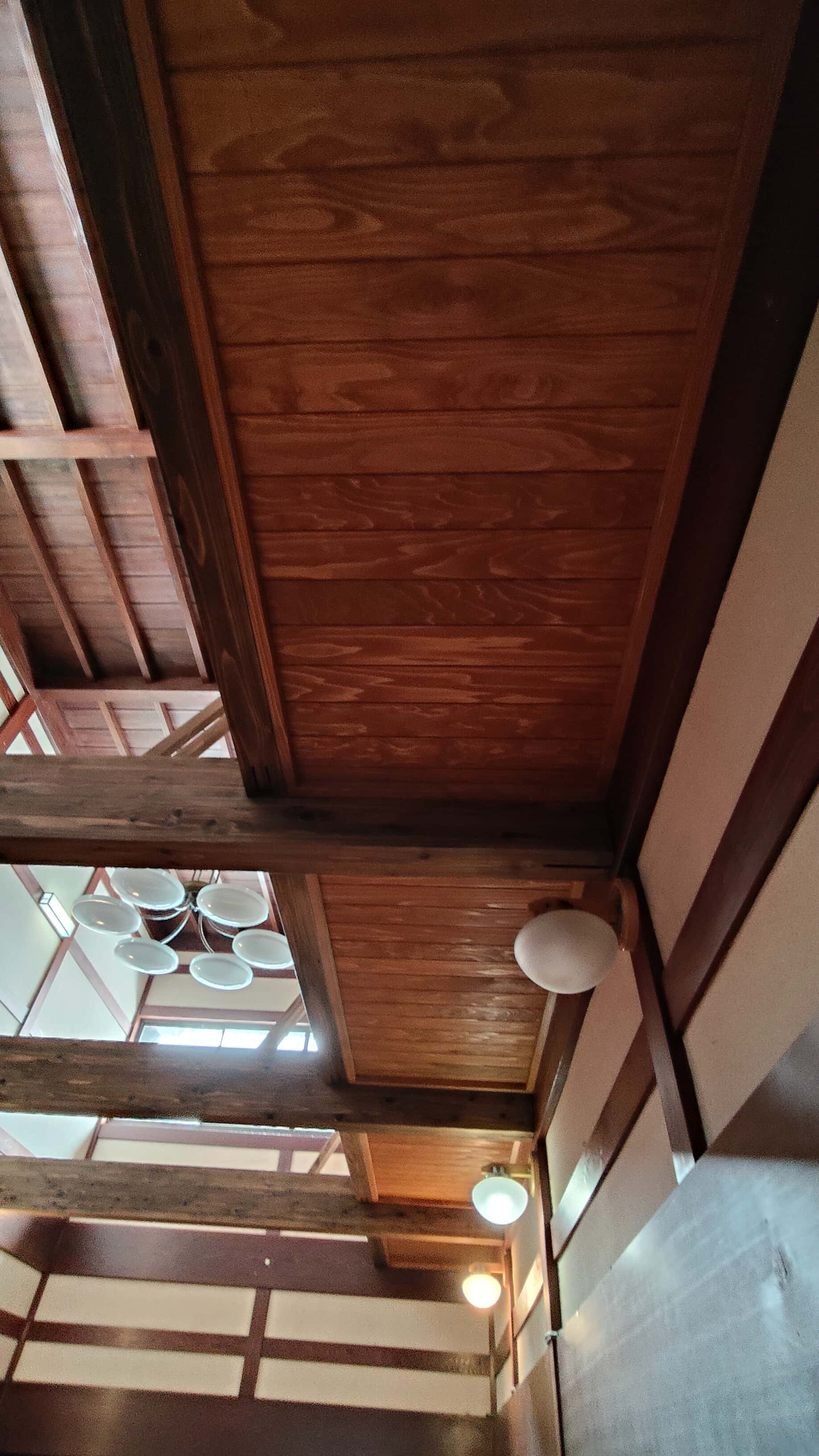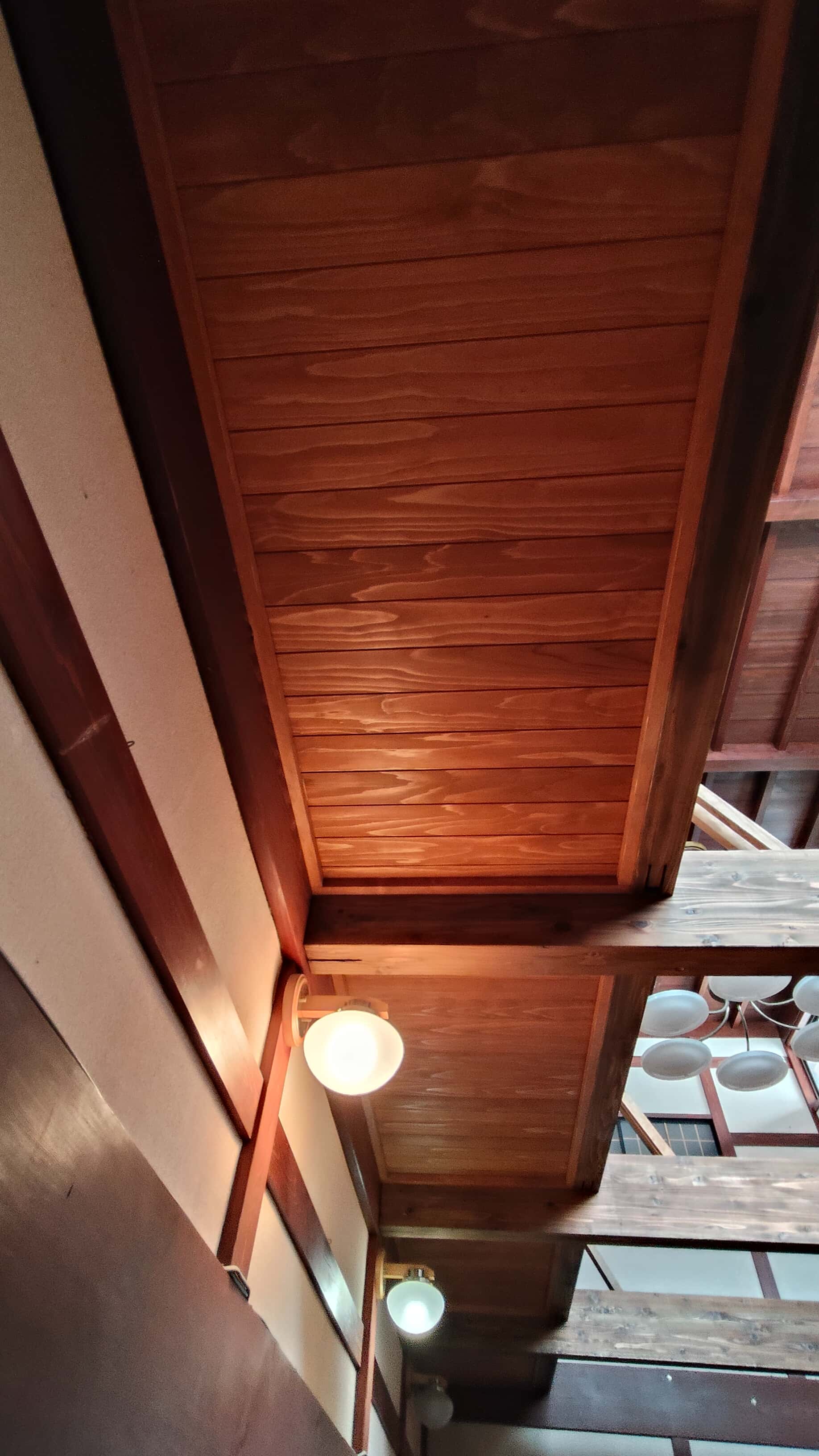 床の裏の部分は杉の羽目板をつかってます。もちろん県産材杉です。こちらも照明の色と相まってイイ感じになってます。