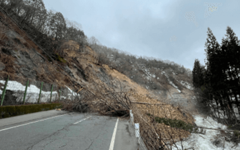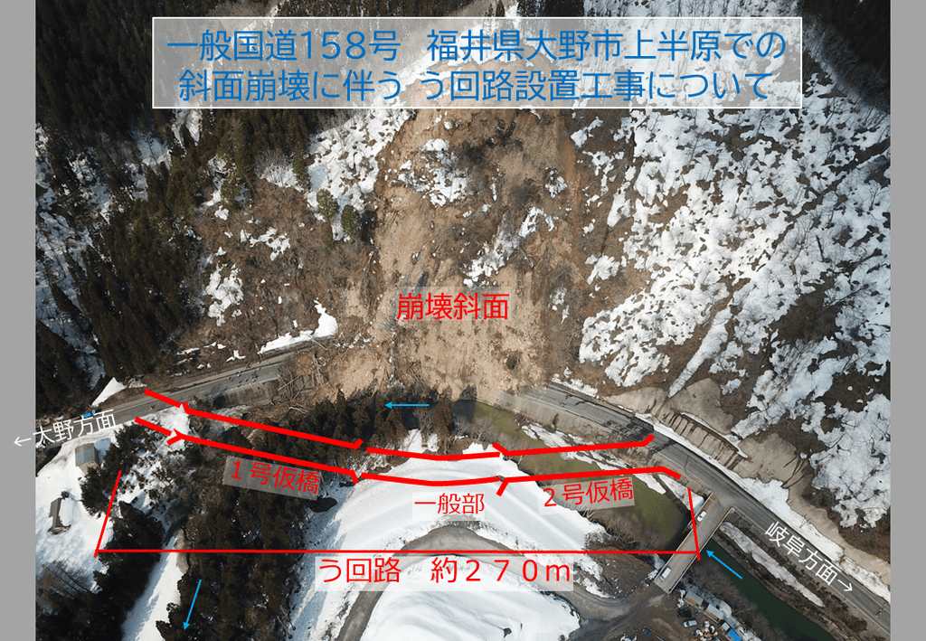 この土砂崩れは、令和7年3月19日発生したもので、斜面崩壊により158号線の一部が土砂で覆いつくされ通行ができない状況でありました。災害発生場所は、現在工事中の中部縦貫道の未完了工事区としての道路を完全に通行止めにすることになり、事実上、岐阜県境白鳥方面からのアクセスを不可能にしてしまいました。また、工事中の中部縦貫道は、地形、地質等による橋脚建設の見直しを迫られ、再調査などの現地調査を進めていた中での通行止めとなり、中の中部縦貫道の工事遅延のさらなる原因にもなっていました。