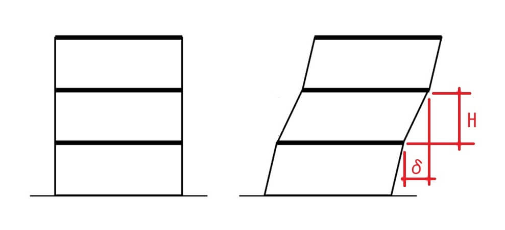 建築基準法では、建物の「層間変形角」といって地震の時の各階が水平力を受けて変形する際の限界値を決めてます。