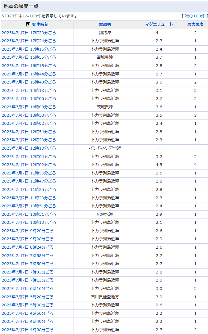 トカラ列島では連日、地震でゆれています。ネットで地震の履歴が見れるのですが、1,2分おきにゆれてるような状態です。