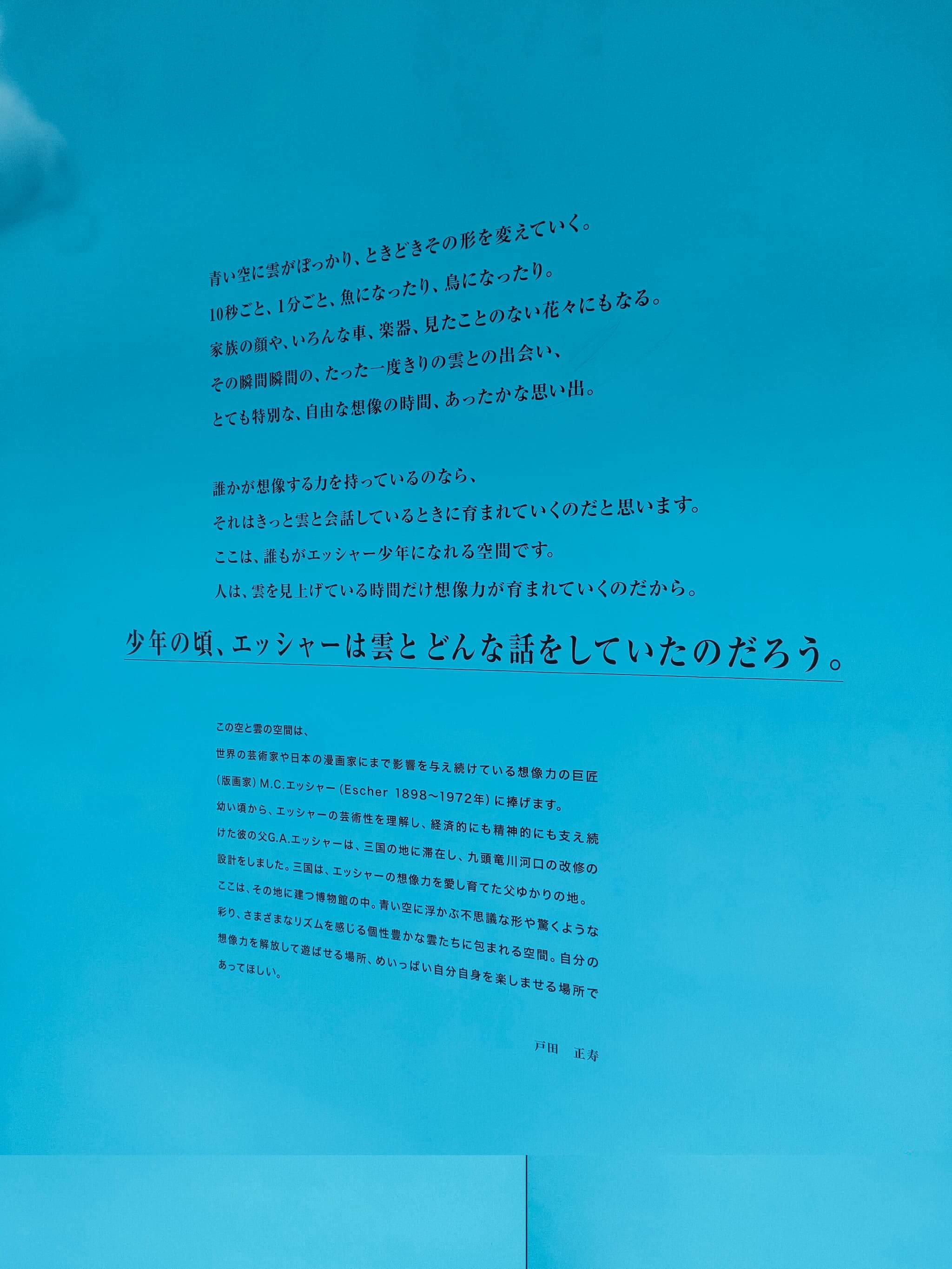 この博物館の六角形の最上階には突堤の設計を行ったエッシャーを偲んで、アートな空間があります。元々、みくに龍翔館時代には、だまし絵の展示があったのですが、「雲」をイメージした空間に生まれ変わりました。