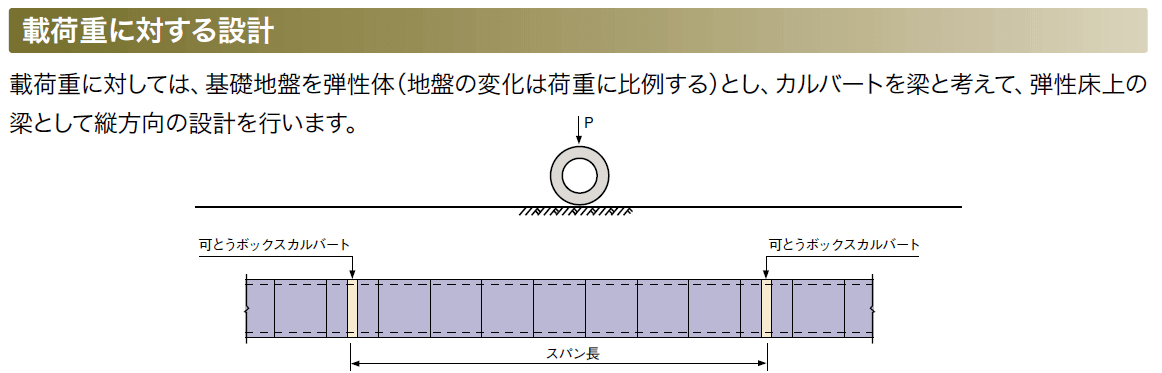 ですが、極々特殊な事例の場合、この地盤の強さが構造物としての鉄筋量などに影響を与えるときがあります。それは、トンネルや水路など、細長いものが地面や土中に敷設される場合です。このとき、この長いものが柔らかい地盤に存在する場合と固い地盤に存在する場合では、上から載荷重がかかった場合の変形が地盤の影響を受け変化します。以下は、ボックスカルバート(暗渠)の場合でのイメージ図です。